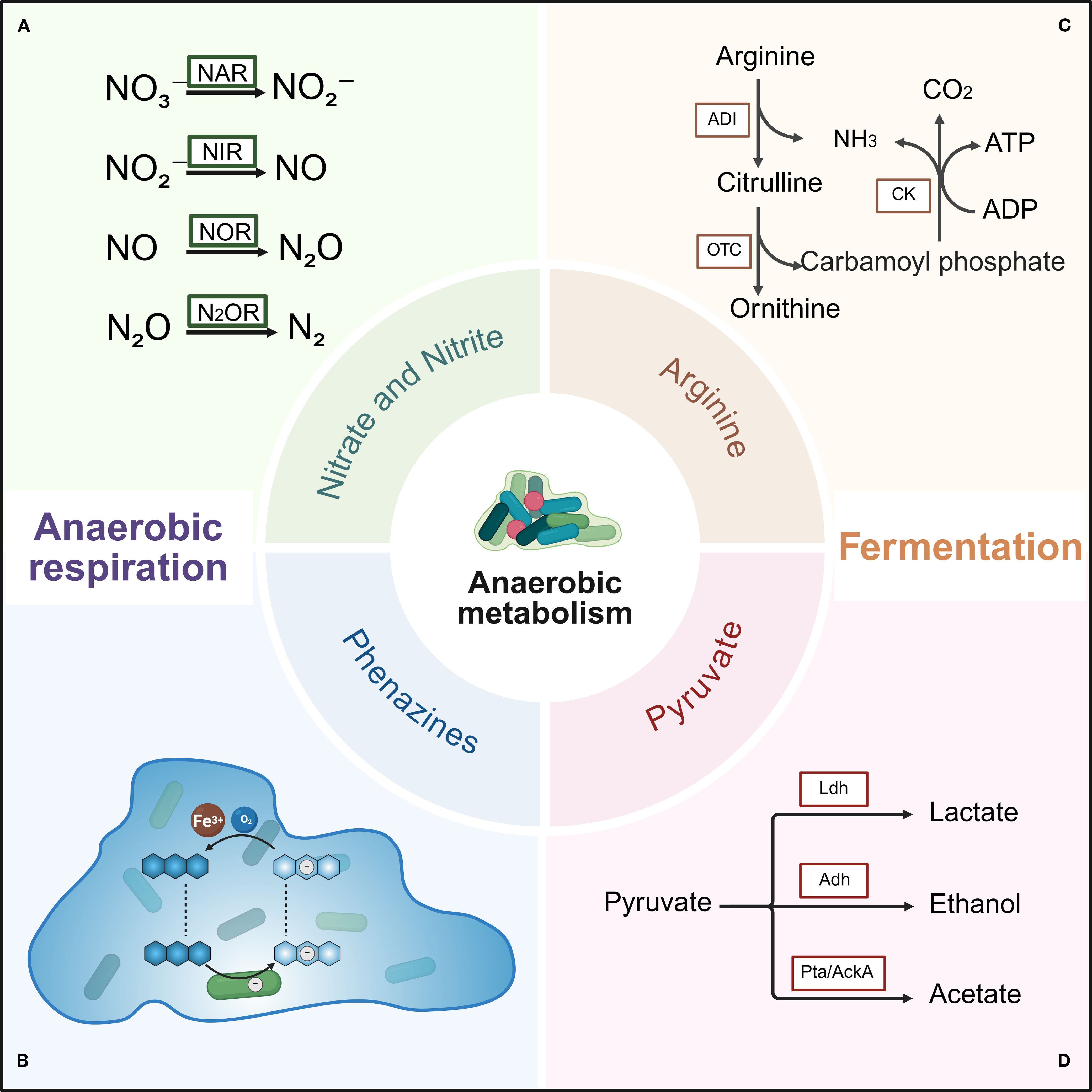 Figure 2. Anaerobic metabolism of P. aeruginosa biofilms under oxygen-limited conditions. Two primary anaerobic metabolic pathways are shown: anaerobic respiration and fermentation. Anaerobic respiration mainly involves denitrification pathways utilizing nitrate and phenazine to maintain cellular redox balance. Fermentation includes the arginine and pyruvate fermentation pathways, which generate ATP to sustain bacterial survival. (A) Reduction of nitrate, nitrite, nitric oxide, and nitrous oxide by nitrate reductase, nitrite reductase, nitric oxide reductase, and nitrous oxide reductase, respectively. (B) Electron transfer cycle of phenazine within biofilm. Cells are represented as rods, phenazine as blue hexagons, electrons as white circles, and oxygen concentration is depicted by the blue background. (C) Arginine deiminase (ADI) pathway. Key enzymes include arginine deiminase (ADI), ornithine carbamoyltransferase (OTC), and carbamate kinase (CK). (D) Pyruvate fermentation pathway. Key enzymes include lactate dehydrogenase (Ldh), alcohol dehydrogenase (Adh), phosphate acetyltransferase (Pta), and acetate kinase (AckA). Created with BioRender.com.