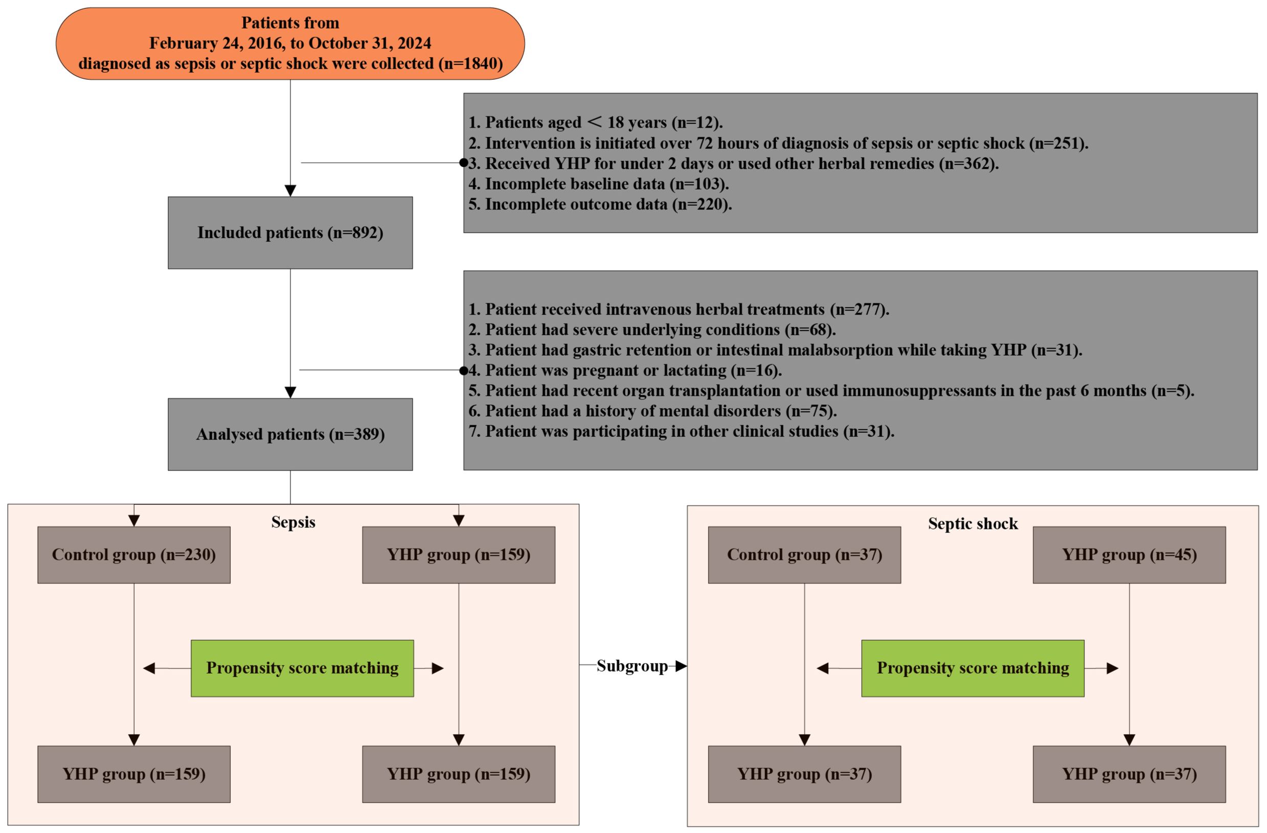 Herbal medicines serve as effective adjuvant therapeutic agents for numerous infectious diseases (Liang et al., 2022; Yuan, 2022). Yiqi Huoxue Jiedu Formula (YHJF, Patent Number: ZL202211547052.1) is an herbal compound consisting of Ginseng Root (Ginseng Radix et Rhizoma), Sanchi (Notoginseng Radix et Rhizoma), and Rhubarb (Rhei Radix et Rhizoma). Initial clinical observations suggested that this formula might possess potential benefits in treating sepsis and septic shock. Subsequent study demonstrated that YHJF can enhance the 7-day survival rate in septic mice (Chen et al.). Nonetheless, these results were derived from clinical observations or animal research. There remains a paucity of evidence-based data regarding the efficacy of YHJF in clinical settings for these conditions. Therefore, we conducted a retrospective cohort study comparing sepsis and septic shock patients treated with YHJF in 4 sub-centers to those who did not receive herbal treatment, to evaluate YHJF’s clinical efficacy.