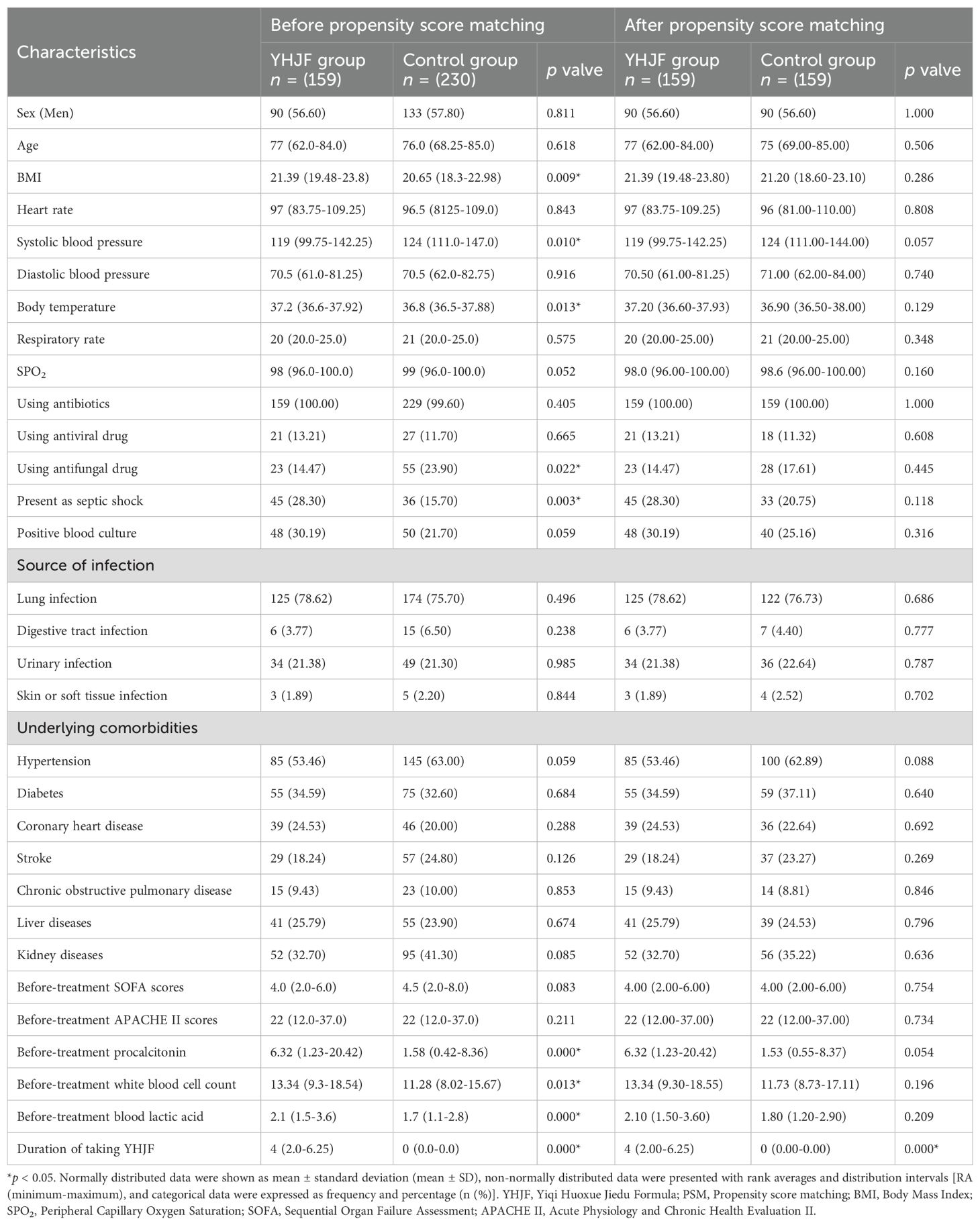 Table 3. Baseline characteristics of the YHJF and control groups before and after PSM in the septic shock cohort.