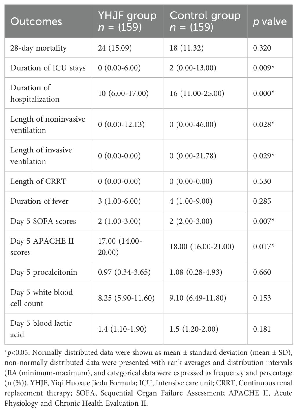 All patients received treatment systematically in alignment with the protocols outlined in the Western medicine guidelines(1). Patients in the YHJF group received only YHJF alongside the standard treatment protocols either orally or via a nasogastric tube. The YHJF herbal decoction was prepared by the hospital’s preparation center. One dose of crude drug (Ginseng Root 15 g, Sanchi 9 g, and Rhubarb 3 g) was boiled into two doses of 50–100 ml each, with one dose administered in the morning and the other in the evening daily. Inclusion in the study required patients to have received YHJF for a minimum of two days. In contrast, patients in the control group were treated solely according to the Western medicine guidelines and did not receive any herbal preparations during the efficacy evaluation period.