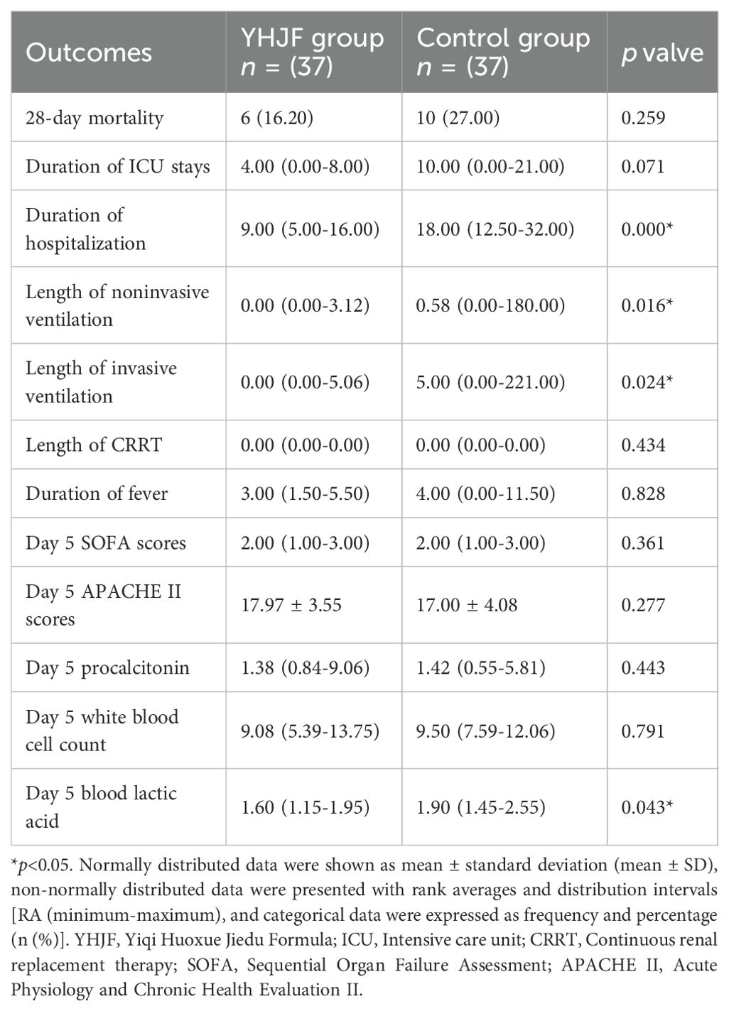5. Outcome data can be collected, including 28-day mortality, duration of ICU stays, total length of hospital stays, duration of non-invasive and invasive ventilator use, length of continuous renal replacement therapy (CRRT), number of febrile days, SOFA and APACHE II scores, procalcitonin levels, white blood cell count, and blood lactate in the fifth days post-treatment.