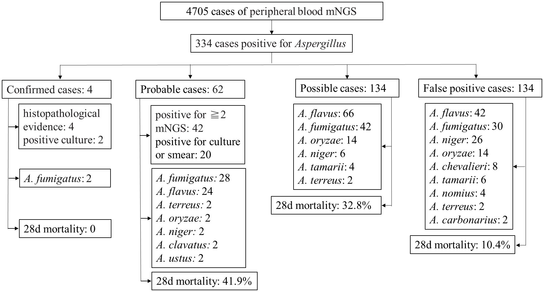 Timely and accurate diagnosis with effective treatment is a key factor in improving prognosis and reducing unreasonable use of antibiotics. The definitive diagnosis of Aspergillus infection relies on microscopic examination or culture. Microbiological evidence for the clinical diagnosis of aspergillosis mainly includes microscopic examination, cultures, Aspergillus galactomannan, or nucleic acid detection. However, the positive rate of culture for clinical samples is low. In 2020, Aspergillus PCR (Molecular Diagnostic Assays) was included in the definition of invasive aspergillosis, requiring two positive results to provide sufficient specificity for confirmation of the diagnosis (Koehler et al., 2021). Metagenomic Next Generation Sequencing (mNGS) is a broad and highly sensitive pathogen detection method that can accurately differentiate fungi to the species, and even subspecies level. This technology has the potential to improve the sensitivity of detection for invasive fungal infections (Jenks et al., 2023). Therefore, we aim to explore the diagnostic value of plasma mNGS in Aspergillus infections. Here, we retrospectively analyzed the clinical data of 167 patients with detectable Aspergillus spp. in plasma mNGS at 4 hospitals, Zhejiang, from February 2021 to December 2022, and the findings are summarized as follows.