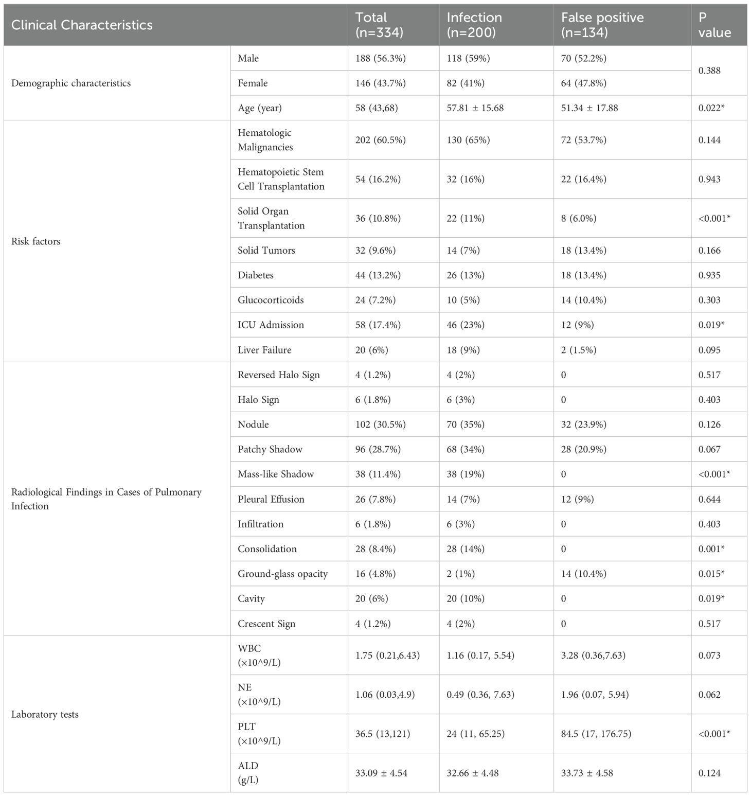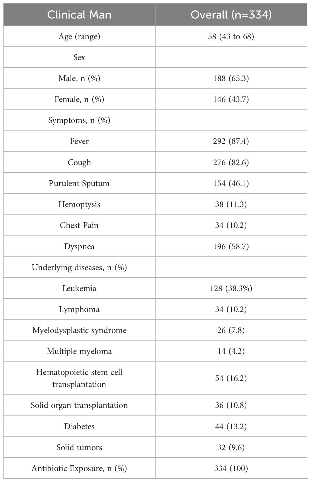 A total of 334 patients were included, comprising 188 males (56.3%) and 146 females (43.7%), with a median age of 58 years (range 43 to 68). Underlying diseases included hematological malignancies in 202 cases, with 128 cases of leukemia (38.3%), 34 cases of lymphoma (10.2%), 26 cases of myelodysplastic syndrome (7.8%), and 14 cases of multiple myeloma (4.2%). There were 54 cases post-hematopoietic stem cell transplantation (16.2%), 36 cases post-solid organ transplantation (10.8%), and 44 cases of diabetes (13.2%). Other underlying conditions included 32 cases of solid tumors (9.6%), among others, Table 1. Overall clinical and pathogen diagnosis of the recruited patients are showed in Figure 1.
