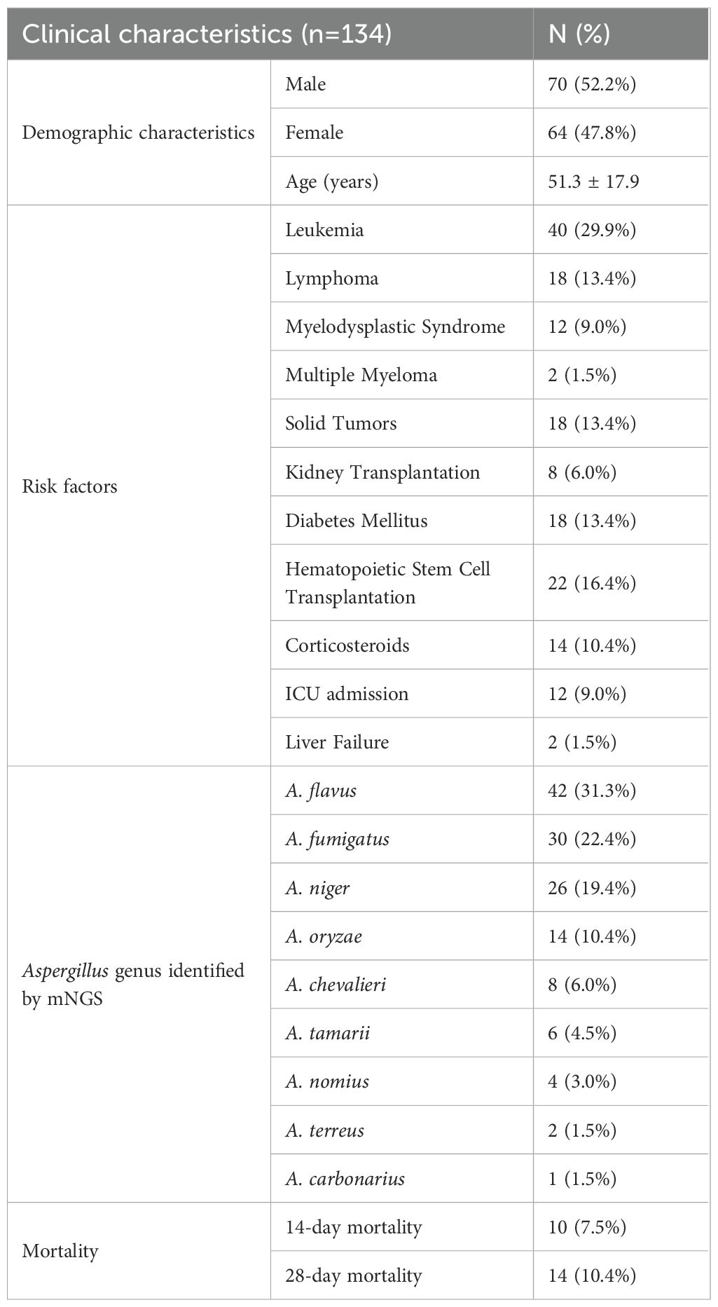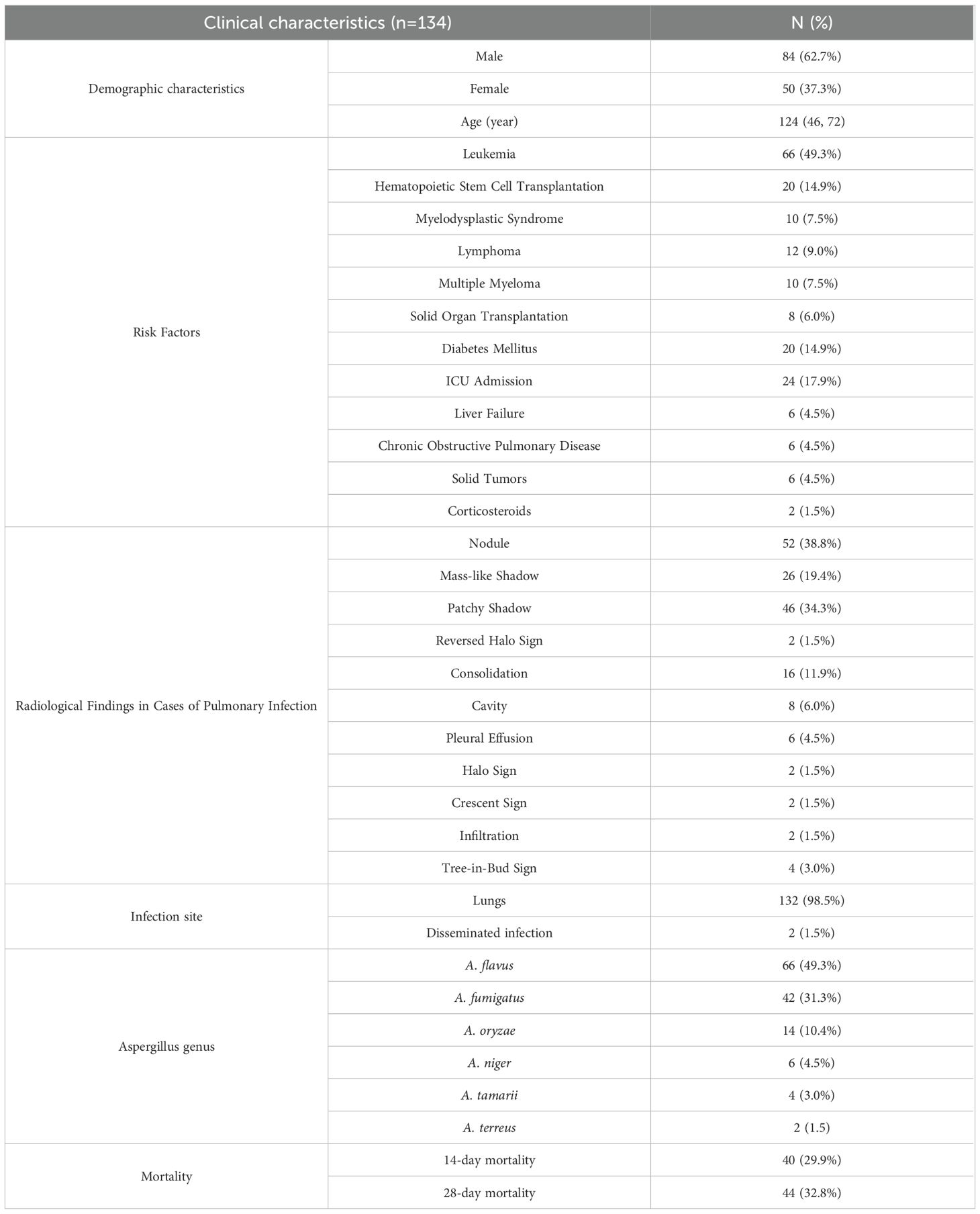 There were 134 suspected cases, including 84 males (62.7%). These patients, in addition to one instance of blood mNGS detecting Aspergillus, also presented with both the risk factors for Aspergillus infection and clinical features consistent with Aspergillus infection. Clinical characteristics are detailed in Table 2.