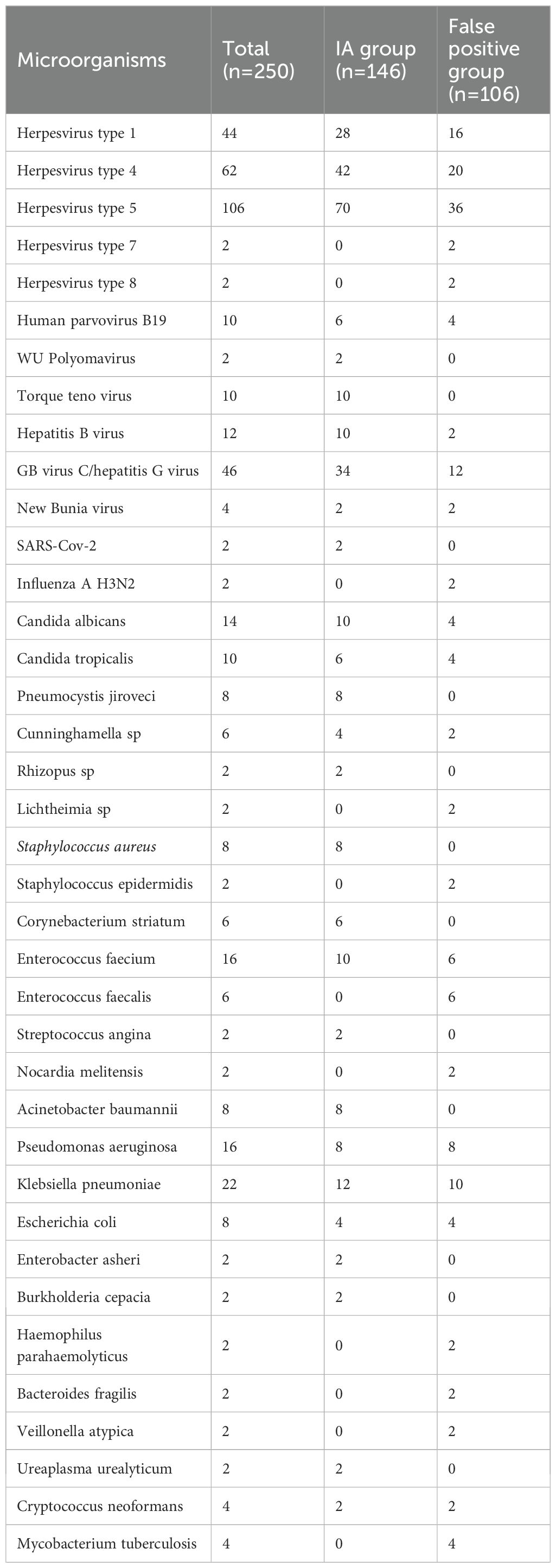 Only Aspergillus was detected in the plasma of 84 patients, and other microorganisms were detected in the plasma of 250 patients. The combined detected microorganisms are listed in Table 4. In IA group and false positive group, there was no significant difference in the detection of pathogens other than Aspergillus spp.