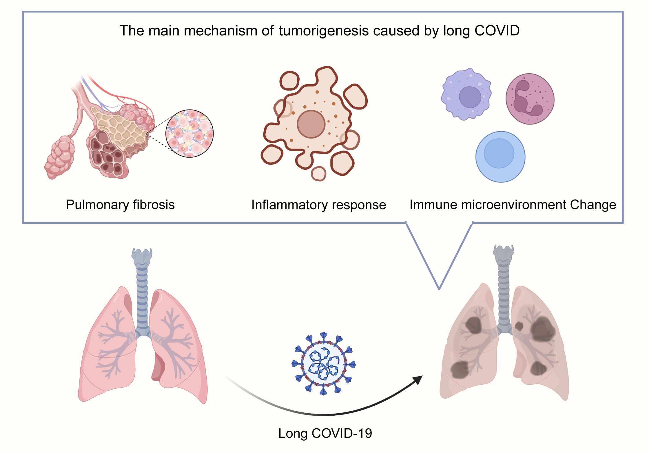 Accumulating epidemiological evidence points to a significant association between SARS-CoV-2 infection and an elevated risk of lung cancer development, particularly among individuals experiencing persistent symptoms following prolonged COVID-19 infection. This potential link has garnered increasing attention within the medical research community (Huang et al., 2021). Notably, cancer patients themselves exhibit heightened susceptibility to SARS-CoV-2 infection and experience poorer clinical outcomes. This susceptibility and prognostic significance are primarily reflected in increased mortality risk (Oldani et al., 2022), more severe clinical manifestations (Dai et al., 2020), and a higher likelihood of infection (Wang et al., 2021). This section delineates the postulated mechanisms underpinning the potential association between Long COVID and lung carcinogenesis.