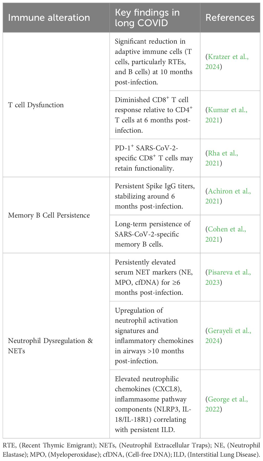 Long COVID is associated with profound and persistent alterations in immune cell composition and function. Studies report significant increases in neutrophils, monocytes, NK cells, and CD4+ T cells in Long COVID patients, alongside decreases in total lymphocytes and CD8+ T cells. Cytokine profiling reveals significantly elevated levels of IL-6, TNF-α, IFN-γ, IL-2, IL-4, and IL-10 in hospitalized patients, suggesting potential skewing of CD4+ T cell differentiation (Lin et al., 2020). This section explores how key immunological features of Long COVID-T cell exhaustion, persistent memory B cell responses, and neutrophil extracellular trap (NET) formation – may impact the lung cancer immune microenvironment (summarized in Figure 2 and Table 1).