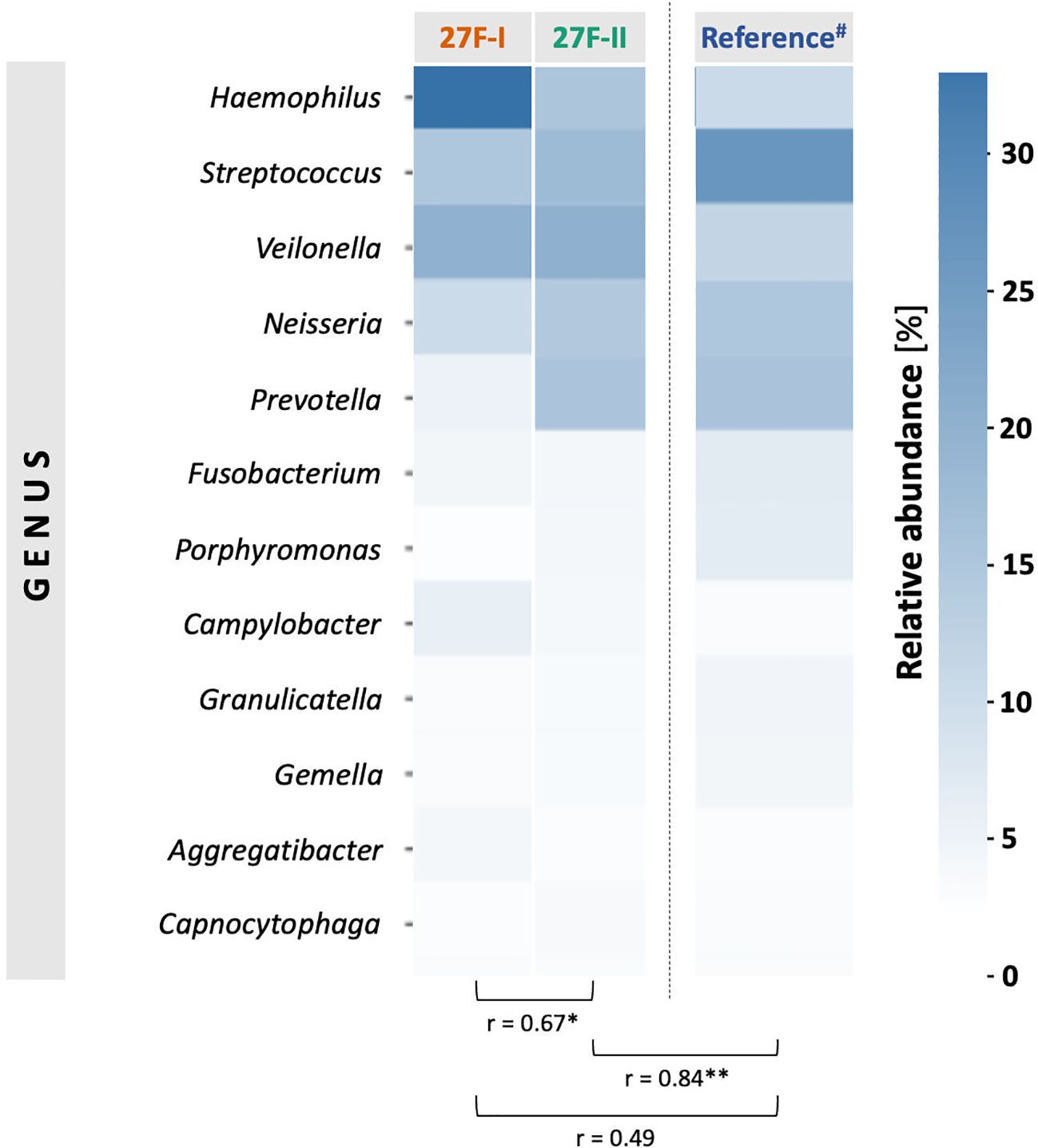 Heatmap showing the relative abundance of different genera across three sample types: 27F-I, 27F-II, and Reference. Genera listed include Haemophilus, Streptococcus, and Veillonella, among others. Color shades represent abundance percentages, with darker shades indicating higher values. The highest abundance is seen in Haemophilus for 27F-I. Correlation coefficients are noted below for the samples.