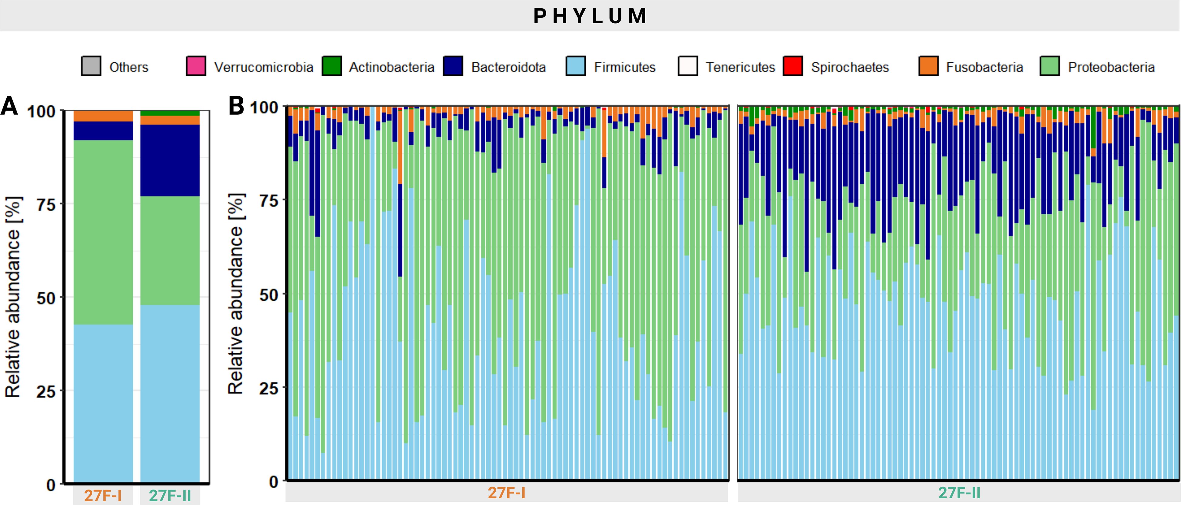 Bar charts display the relative abundance of different bacterial phyla. Chart A contrasts 27F-I and 27F-II, while chart B shows detailed variations within each group. Phyla include Proteobacteria, Firmicutes, and Bacteroidota, among others, represented by different colors.