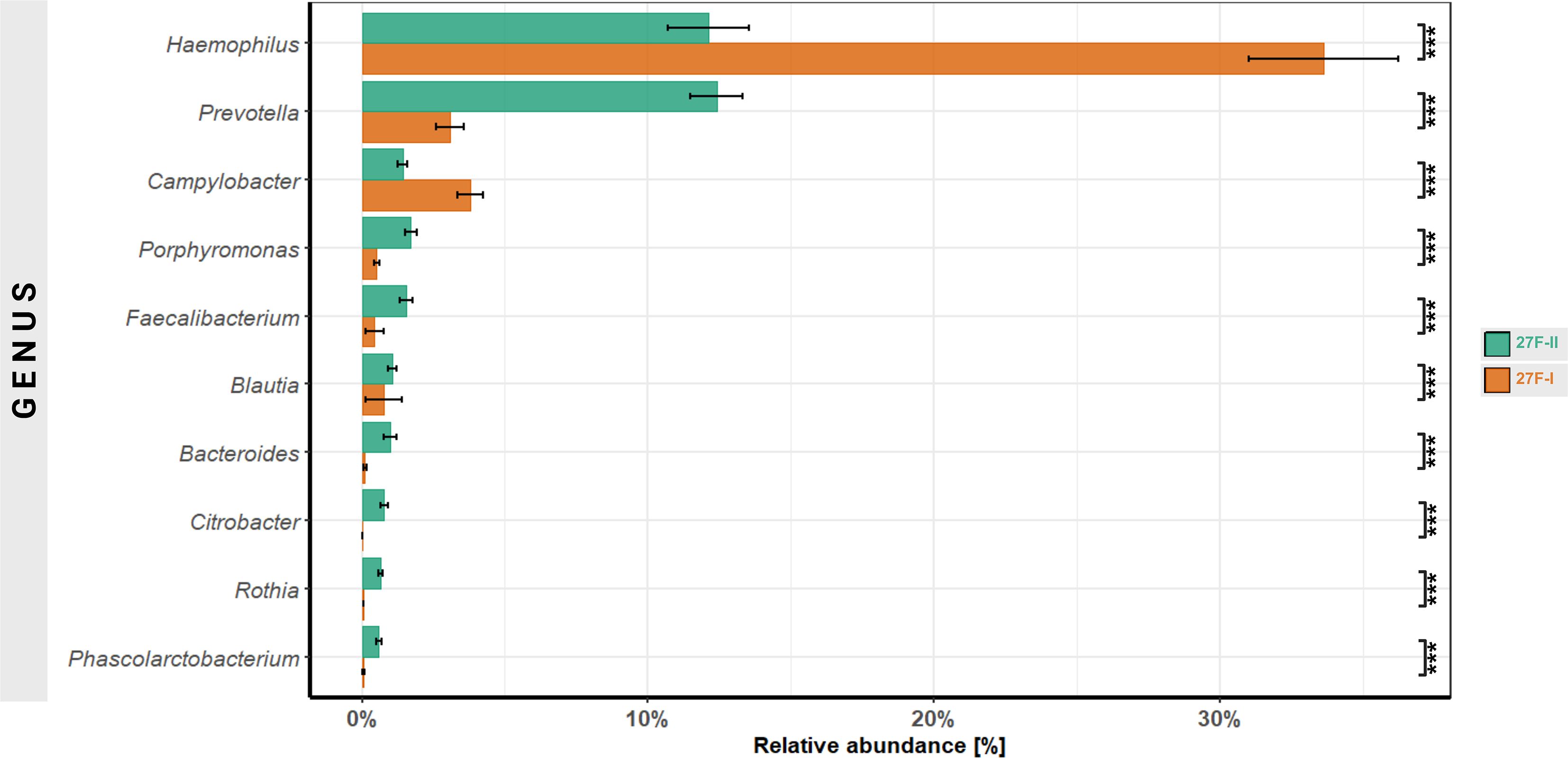Bar chart showing the relative abundance of different bacterial genera, with Haemophilus and Prevotella having the highest percentages. Two conditions, 27F-I and 27F-II, are compared. Positive bars with error lines indicate variance. Significant differences are marked with asterisks beside each genus.