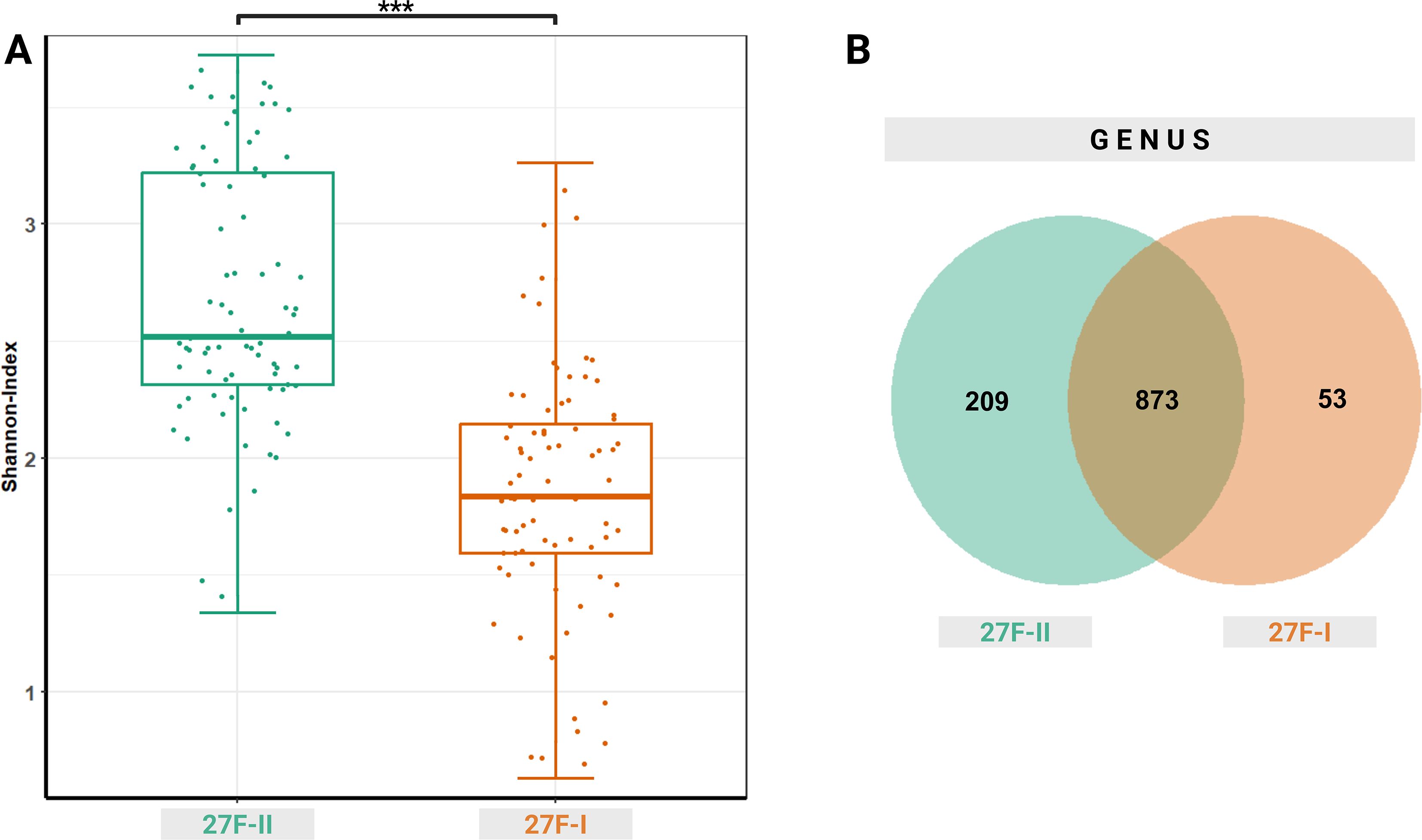 Box plot and Venn diagram comparing microbiome diversity and genus overlap. In A, the box plot shows Shannon Index scores for groups 27F-II and 27F-I, with 27F-II having higher diversity. In B, the Venn diagram depicts genus overlap, with 209 unique to 27F-II, 53 unique to 27F-I, and 873 shared.
