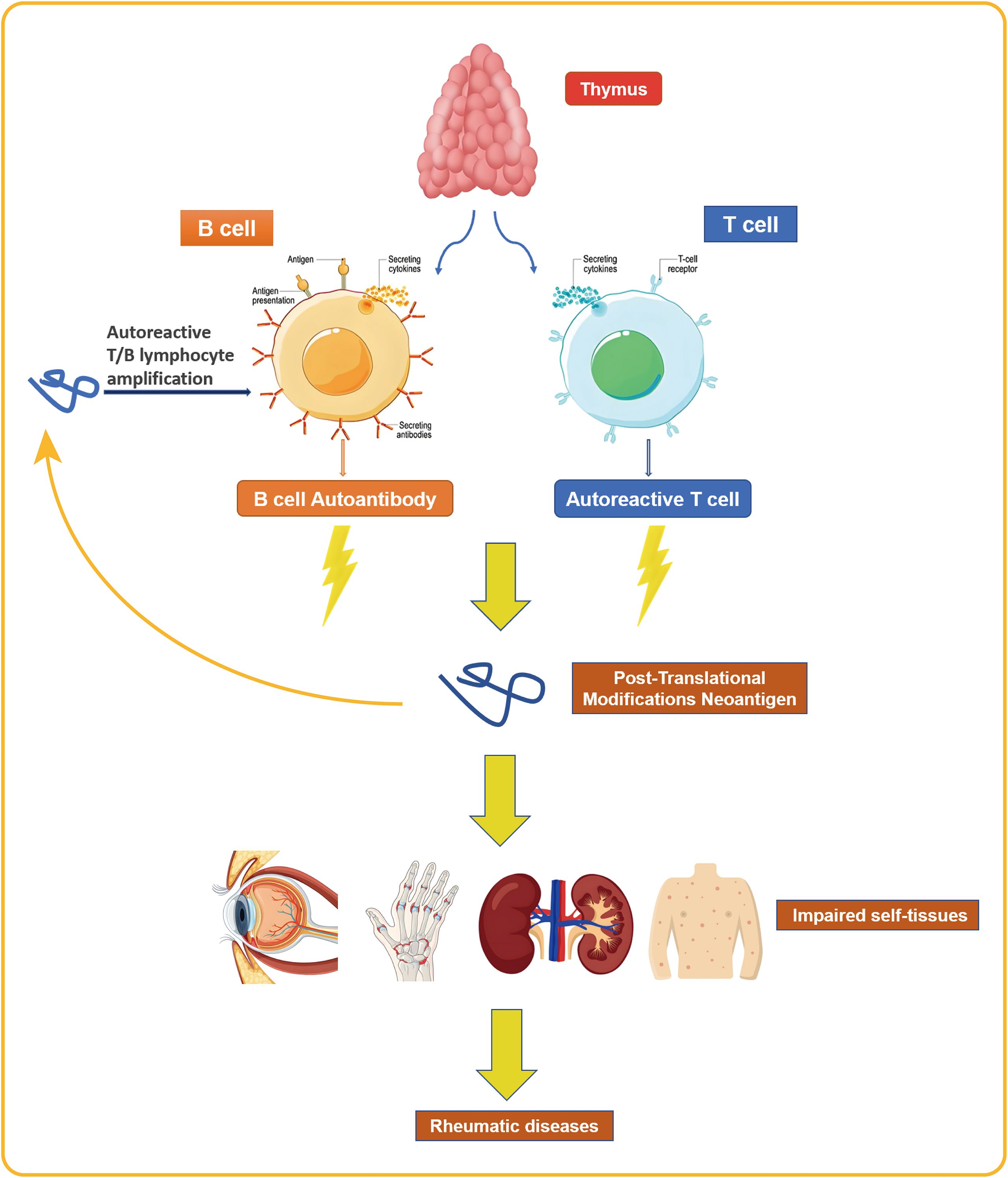 Figure 2. The activation and proliferation of autoreactive T and B cells results in the recognition and damage of the body’s own tissues, a pathogenic process that ultimately leads to the development of rheumatic diseases.