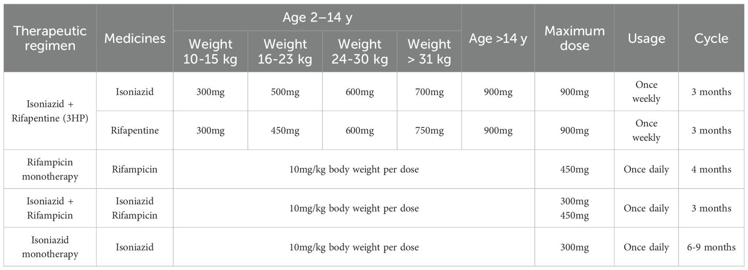 Currently, there are no pediatric data available regarding the timing of preventive antituberculosis therapy for patients with rheumatic diseases and LTBI. As stipulated in the adult clinical practice guidelines (Wang et al., 2022), treatment strategies must be tailored to disease severity and the urgency of biologic intervention. In cases of severe disease requiring immediate biologic therapy, a thorough assessment of the patient’s risk for LTBI reactivation is imperative; should the risk be deemed significant, biologic agents should be initiated concurrently with preventive antituberculosis treatment. If the condition allows for delaying treatment with corticosteroids, traditional disease-modifying DMARDs, or biologic DMARDs (non-TNF inhibitors), anti-rheumatic therapy should be initiated one month after the completion of preventive antituberculosis therapy. TNF inhibitors should be initiated as late as possible after completion of preventive anti-tuberculosis therapy. According to the expert consensus on the diagnosis and treatment of rheumatic diseases in patients with latent tuberculosis infection in China, there are four main preventive anti-tuberculosis treatment regimens for LTBI in pediatric rheumatic diseases (Table 2). The first is the weekly regimen of isoniazid combined with rifapentine (3HP regimen): Take isoniazid plus rifampicin for three months. This regimen is a newly added preventive anti-tuberculosis treatment regimen internationally. Its advantages include a short treatment duration, a high treatment completion rate, and good efficacy. However, its disadvantages include higher costs, although it reduces the number of doses; each dose requires a larger number of tablets (Sterling et al., 2011; Villarino et al., 2015; Sterling et al., 2020). The second is the daily rifampicin monotherapy regimen: taking rifampicin for 4 months. The efficacy is similar to that of isoniazid monotherapy, but with lower hepatotoxicity. The drawback is that it has more drug interactions, such as reduced efficacy of tofacitinib when used in combination with rifampicin (Latent tuberculosis infection: updated and consolidated guidelines for programmatic management, 2018). The third is the daily therapy combining isoniazid and rifampicin: taking isoniazid + rifampicin for 3 months. Compared with the single-drug therapy with isoniazid, the efficacy is similar, but the treatment time is shorter, and the compliance and completion rates are higher. It is one of the recommended first-line treatment regimens internationally (Wang et al., 2020). A significant disadvantage of this combination regimen is the elevated risk of hepatotoxicity compared to monotherapy. A fourth therapeutic option is a six- to nine-month daily course of isoniazid monotherapy. The drawbacks of this approach include an extended treatment duration, a lower treatment completion rate, and a persistent risk of drug-induced hepatotoxicity. Pyridoxine (vitamin B6) supplementation with all isoniazid regimens is recommended to reduce the peripheral neuropathy (Fox et al., 2017).