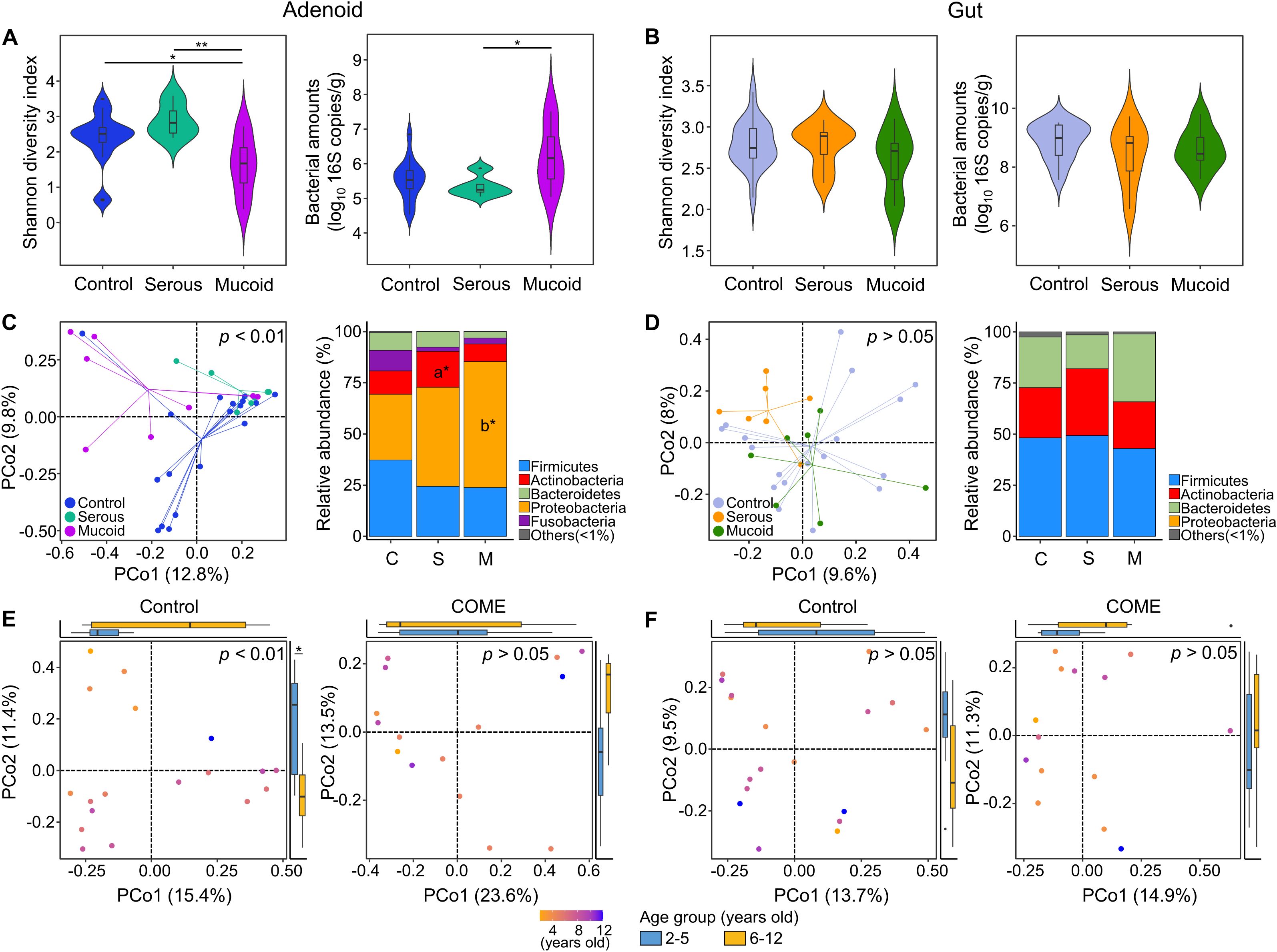 Figure 1. Comparison of adenoid and gut microbiota according to middle ear fluid (MEF) types. Bacterial diversity and amounts are compared according to MEF types in the (A) adenoid and (B) gut microbiome. The composition of microbiota in the (C) adenoid and (D) gut is compared between the control and COME groups in the PCoA plots based on the species-level Bray-Curtis dissimilarity and the bar plots at the phylum level. Age-dependent variations in (E) adenoid and (F) gut microbiota are compared in the control and COME groups. *p<0.05, **p<0.01, a*p<0.05 between control and serous groups, b*p<0.05 between control and mucoid groups. COME, Chronic otitis media with effusion; PCoA, Principal coordinates analysis.