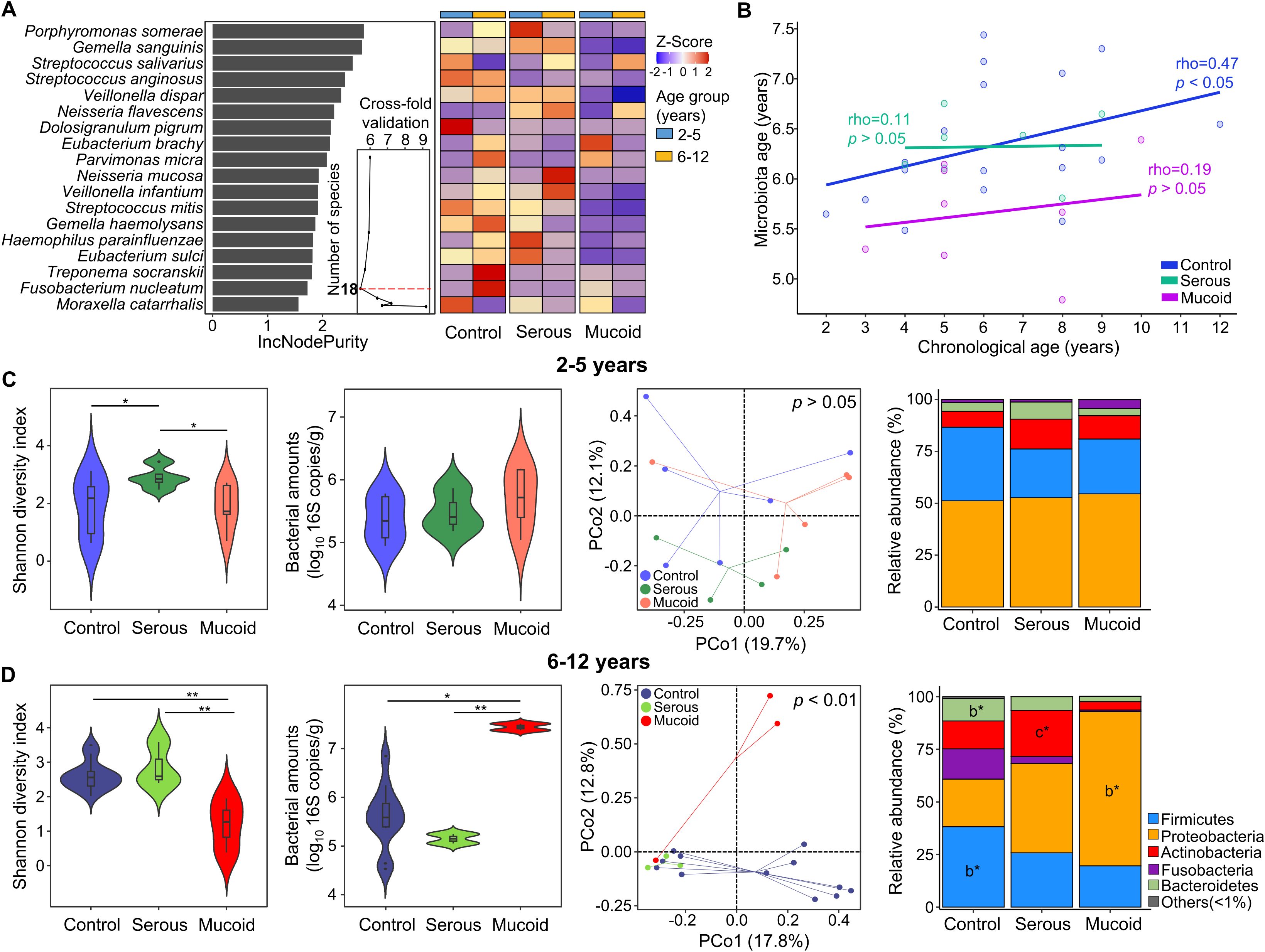 Figure 2. Perturbation of age-dependent variations in adenoid microbiota among COME groups. (A) Species importance in the prediction model of microbiota according to age within the control group. The 18 species with the highest discriminating power are selected by the lowest cross-validation error (inner graph). The heatmap displays the comparison of the relative abundance of 18 selected bacterial species across different age groups between the control and COME groups stratified by MEF types. (B) The correlation between chronological age and predicted adenoid microbiota age in the control and COME groups. (C) The microbiota and bacterial amounts are compared according to MEF types in children aged 2–5 years. (D) The microbiota and bacterial amounts are compared according to MEF types in children aged 6–12 years. *p<0.05, **p<0.01, b*p<0.05 between control and mucoid groups, c*p<0.05 between serous and mucoid groups. COME, Chronic otitis media with effusion; MEF, Middle ear fluid.