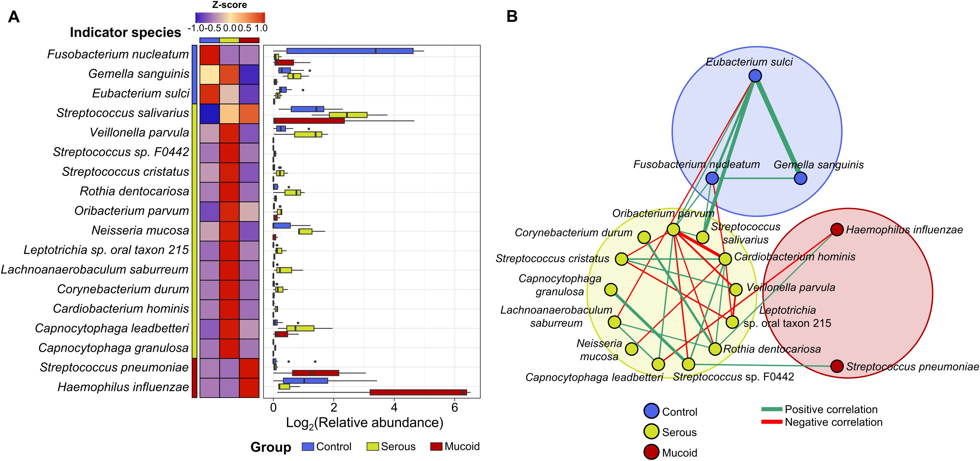 Figure 3. The difference in indicator species in the adenoid microbiota for each group. (A) The heatmap illustrates the comparison of the indicator’s relative abundance based on z-scores among groups. The relative abundances of indicators in each group are compared in the box plot. (B) The interactions between indicator species for each group are analyzed by the network analysis. Positive correlations are marked by green edges and negative correlations by red edges. Edge thickness denotes FastSpar correlation, ranging from -0.4 to 0.4. Only significant correlations with p<0.05 are demonstrated.