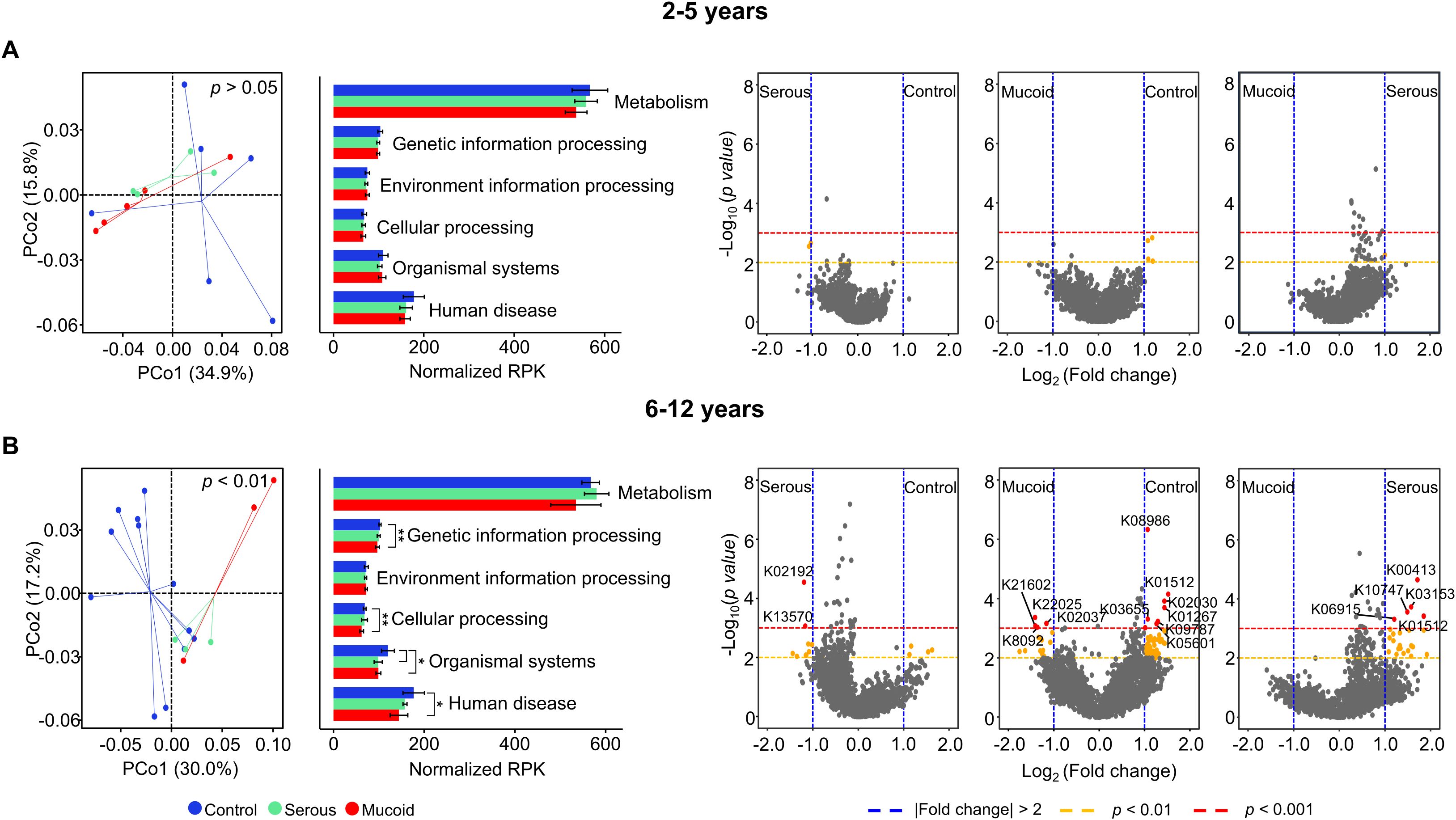 The adenoid microbiome may play different roles in children with COME depending on the age group, as the microbiome demonstrates distinct alterations. To analyze the potential influence of the altered microbiome, functional features based on the KO were compared among groups within each age category. The functional features of the adenoid microbiome were not significantly different among the groups according to MEF types in the children aged 2–5 years (p > 0.05; Figure 4A). Although seven gene families differed among the groups (p < 0.01), they did not significantly contribute to the functional differences of the adenoid microbiome according to MEF types. However, the functional features of the adenoid microbiome significantly differed among groups within 6–12-year-old age group (p < 0.01; Figure 4B). A total of 120 gene families exhibited significant differences across the groups (fold changes > 2 and p < 0.01). Among these 120 significant features, 18 gene families had a p-value < 0.001. The number of features that differed between the control and mucoid COME groups (11 gene families with fold changes > 2 and p < 0.001) was higher than in the other comparisons (two gene families between control and serous COME groups; five gene families between serous and mucoid COME groups). These differences in functional features among the groups were consistent with previous microbiota results (Figure 2).