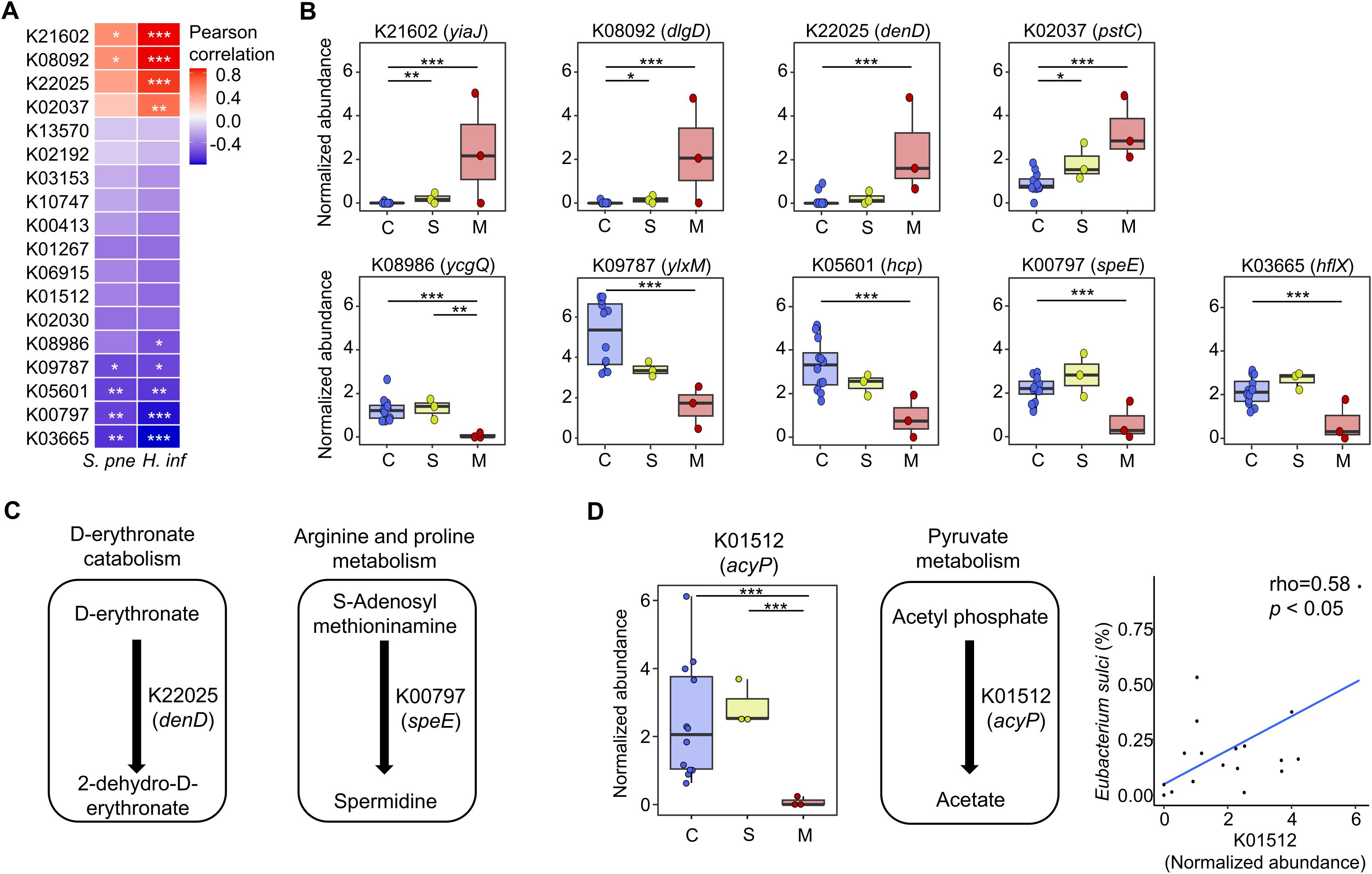 Figure 5. The correlated gene families with indicators for the mucoid COME group are compared among groups. (A) The correlation of significantly different gene families with S. pneumoniae and H. influenzae are analyzed by Pearson correlation analysis. (B) The normalized abundance of significantly correlated gene families with mucoid COME indicators is compared according to MEF types. (C) The reactions of significantly different gene families are demonstrated based on the KEGG database. (D) The commonly different gene families (K01512) in the mucoid COME group compared to those in the control and serous COME groups are detailed. The reactions are displayed based on the KEGG database. The correlation between the relative abundance of Eubacterium sulci and the normalized abundance of K01512 is significant (rho = 0.58, p<0.05). *p<0.05, **p<0.01, ***p<0.001. KEGG, Kyoto Encyclopedia of Genes and Genomes; S. pne, S. pneumoniae; H. inf, H. influenzae.