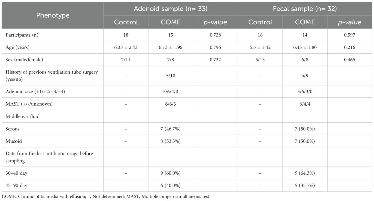 The number of participants, age, and sex were not significantly different between the control and COME patient groups (Table 1). We analyzed 80 WMS data (adenoidal sample = 33, fecal sample = 32, and negative control sample = 15) in this study. The Decontam pipeline was utilized to trim potential contaminant sequences, identified based on the sequences detected in 15 negative controls, encompassing the sampling to library preparation processes (Supplementary Figure 1). Microbiota detected in negative samples significantly differed from those in adenoidal and fecal samples (p < 0.001). Further microbiome analyses were performed after removing potential contaminants.