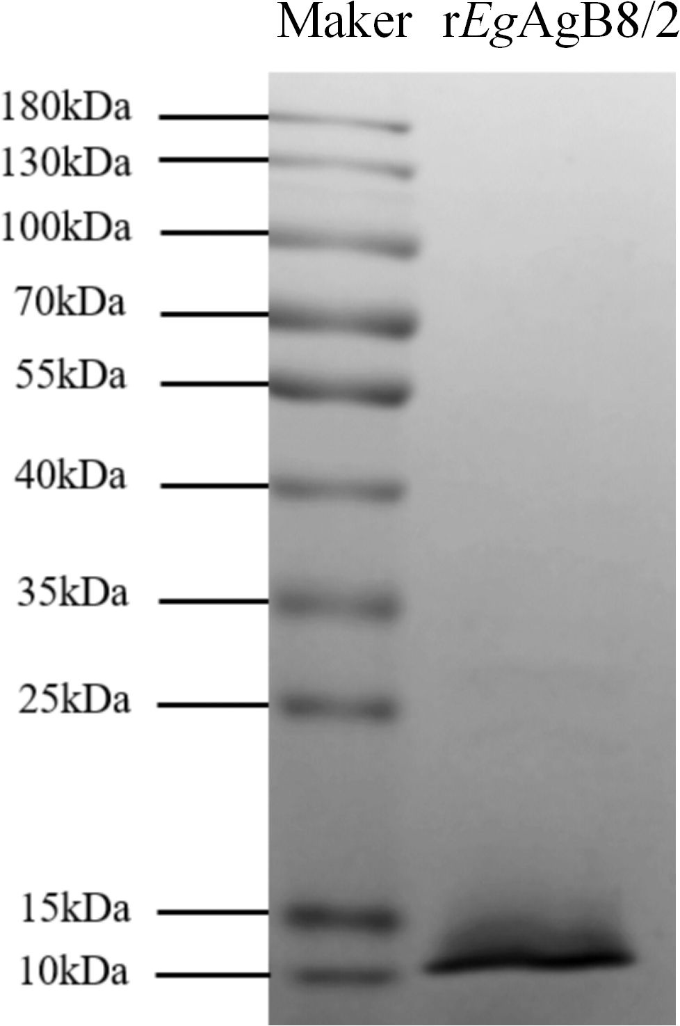 rEgAgB8/2 with 8His-tag at C-terminus was successfully expressed as a soluble recombinant protein in E. coli BL21(DE3) and purified through nickel-affinity chromatography. The contaminated endotoxin was removed by running through endotoxin removal resin and the final endotoxin level of rEgAgB8/2 was reduced to less than 0.1 EU/mg. SDS-PAGE showed that the purified rEgAgB8/2 was approximately 10 kDa in size (including 8His-tag), which was consistent with the deduced theoretical molecular weight (9.4 kDa) (Figure 1).