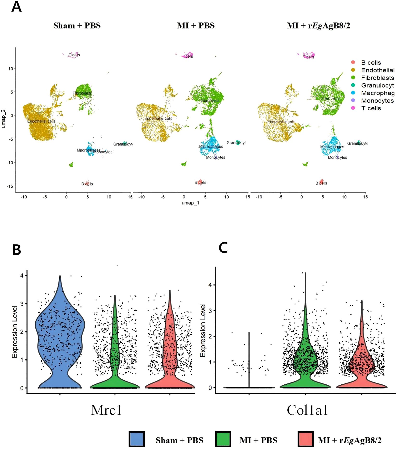 Figure 4. Treatment with rEgAgB8/2 can regulate macrophage polarization and fibrosis levels in the mouse heart. (A) The UMAP plot generated using single-cell RNA sequencing technology illustrates the distribution of different cell types in heart tissues. (B) Violin plot of Mrc1 gene variation in the hearts of mice from different groups. (C) Violin plot of Col1a1 gene variation in the hearts of mice from different groups.
