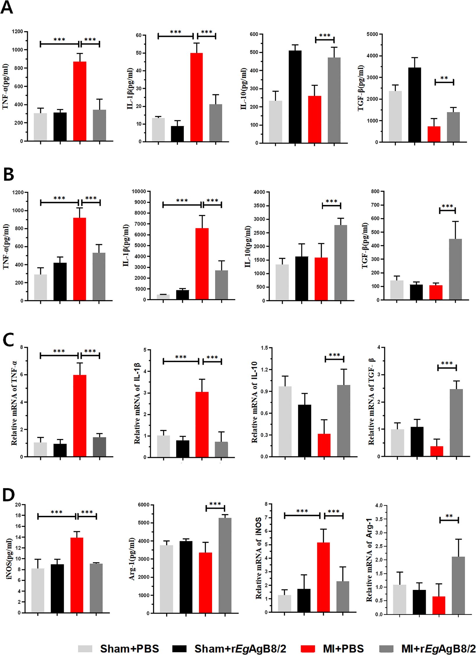 Figure 5. Treatment with rEgAgB8/2 reduced the pro-inflammatory cytokine responses and promoted the polarization of macrophages to the M2 type in MI mice. (A) Treatment with rEgAgB8/2 reduced the pro-inflammatory cytokine levels (TNF-α and IL-1β) and increased IL-10 and TGF-β levels in sera of mice with MI (TNF-α n=6; IL-1β n=5; IL-10 n=6; TGF-β n=6). (B) Treatment with rEgAgB8/2 reduced the pro-inflammatory cytokine levels (TNF-α and IL-1β) and increased IL-10 and TGF-β in the infarct region of the mice with MI (n=5). (C) Treatment with rEgAgB8/2 reduced the mRNA levels of inflammatory factors TNF-α and IL-1β and increased IL-10 and TGF-β in the infarct tissue of mice with MI (n=5). (D) Treatment with rEgAgB8/2 decreased the expression in iNOS (M1 macrophage marker) and increased the expression of Arg-1 (M2 macrophage marker) in MI mice (n=5). The results are presented as mean ± SEM, *P< 0.05, **P< 0.01, ***P< 0.001.