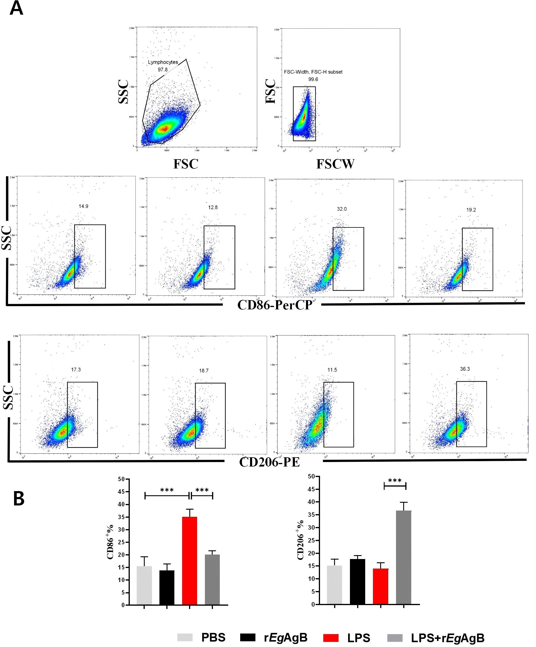 Figure 7. Co-incubation with rEgAgB8/2 inhibited LPS-induced differentiation of RAW264.7 cells into M1 macrophages and promotes their differentiation into M2 macrophages. (A) A flow cytometry gating strategy was used to differentiate adherent cells. (B) Flow cytometer was used to measure the levels of M1 macrophage marker CD86 and M2 macrophage marker CD206 (n=3). The results are presented as mean ± SEM, *P< 0.05, **P< 0.01, ***P< 0.001.