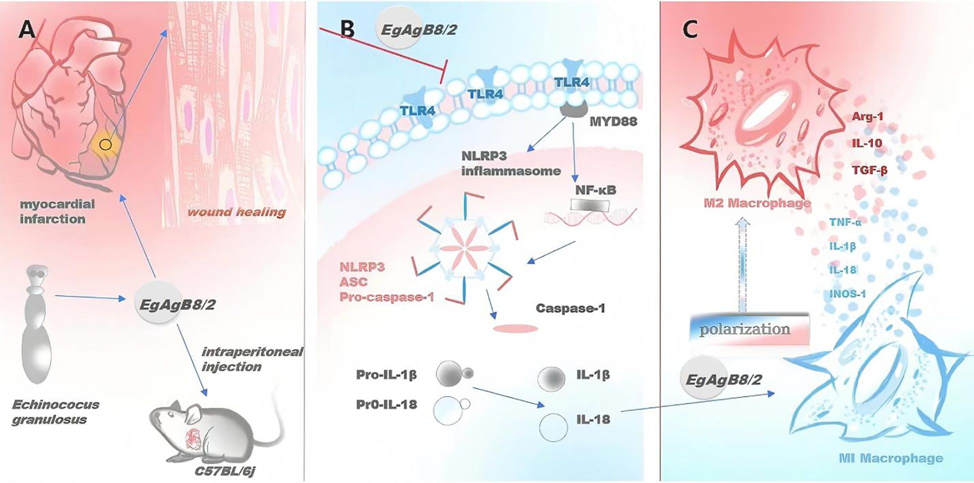 rEgAgB8/2 display a promising therapeutic effect on MI by targeting the NLRP3 inflammasome pathway and modulating macrophage polarization. These findings lay the groundwork for further exploration of rEgAgB8/2 and other helminth-derived proteins in the treatment of cardiovascular diseases associated with excessive inflammation and other inflammatory diseases.