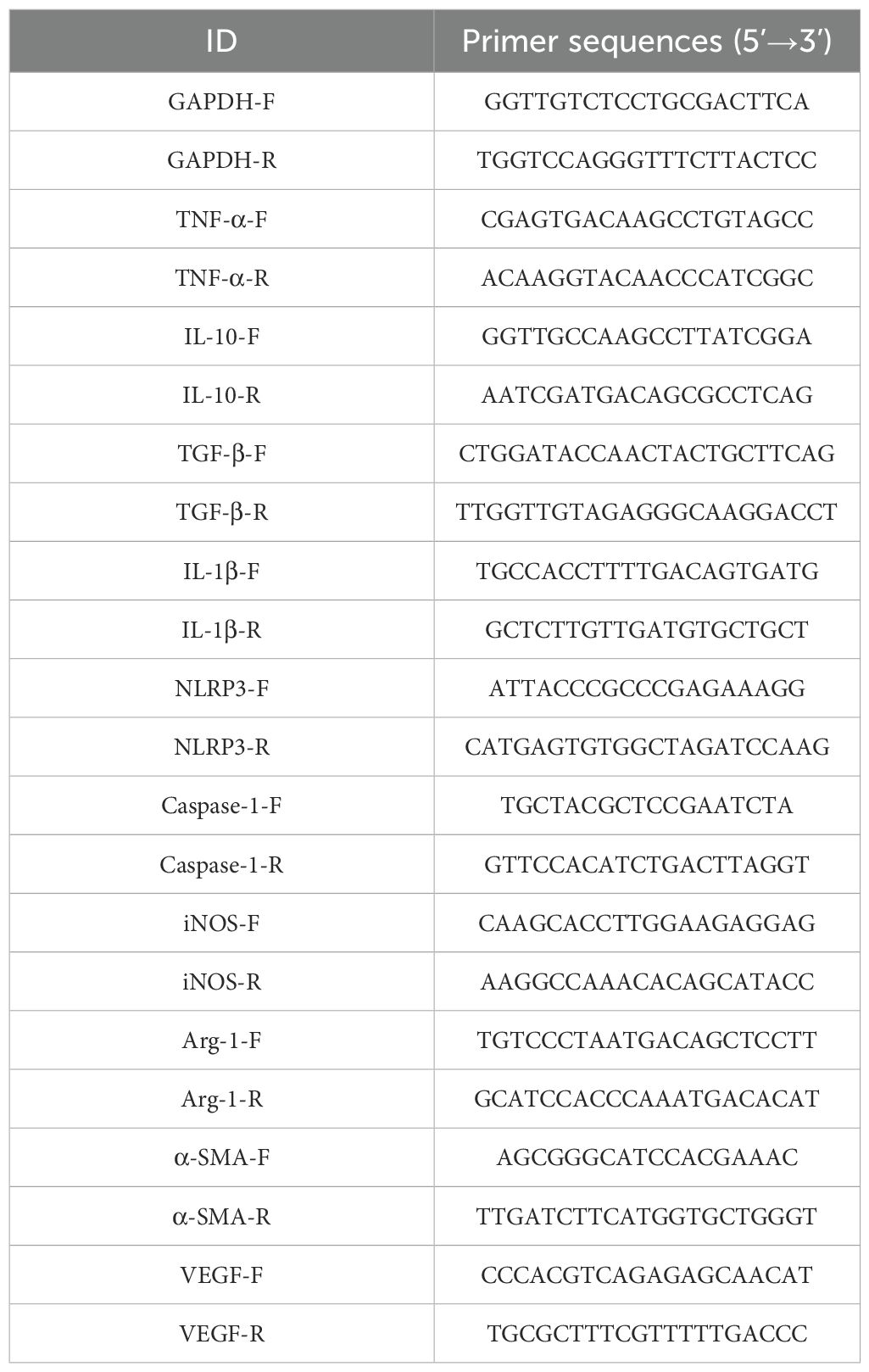 Total RNA was extracted from 100 mg of cardiac infarction tissue using TRIzol reagent (TransGen Biotech, China), following tissue disruption with a rotor-stator homogenizer at 6,000 rpm for 30 seconds. RNA purity was assessed by spectrophotometry, with A260/A280 ratio between 1.8 and 2.1. For reverse transcription, 2 μg of total RNA was used in a 20 μL reaction using reverse transcription kits (TransGen Biotech, China). RT-qPCR was performed using PerfectStart®Green qPCR SuperMix (TransGen Biotech, China) on a Roche LightCycler® 96 system. The specific annealing temperatures and extension times for each primer set (listed in Table 1) were optimized based on primer efficiency tests. GAPDH was used as the internal control, validated under experimental conditions to ensure stable expression. The relative mRNA expression of target genes was calculated using the 2−△△Ct method, and average Ct values were used for calculations.