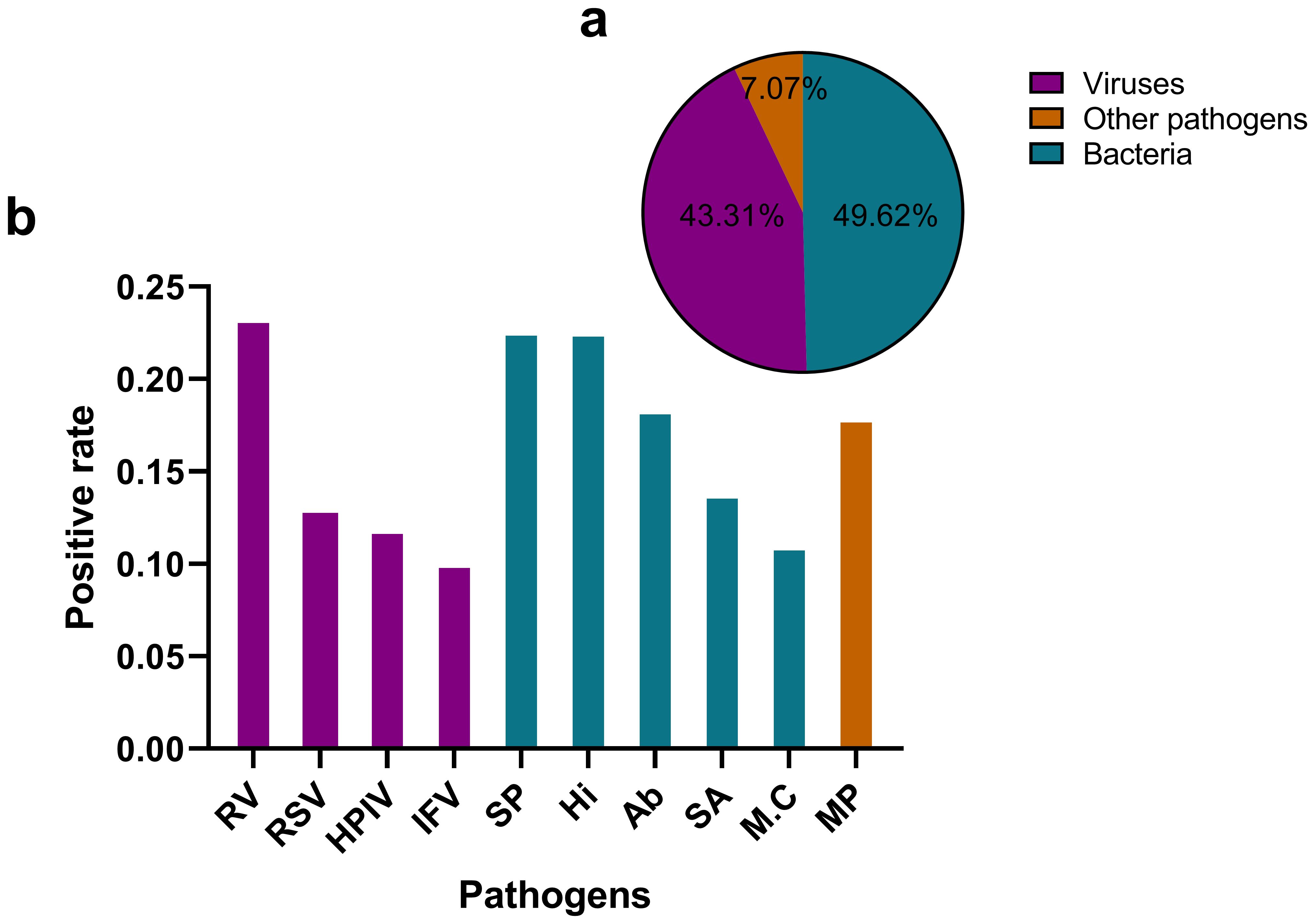 Figure 1. Distribution of pathogen types detected by tNGS in respiratory infections (a) illustrates a pie chart that delineates the distribution of various pathogen categories. Viruses constitute 43.31% of the total, while bacteria represent 49.62%. Other pathogens, which include Mycoplasma pneumoniae, Chlamydia pneumoniae, Chlamydia psittaci, and Chlamydia trachomatis, Ureaplasma urealyticum, Ureaplasma parvum, Mycoplasma hominis, Mycoplasma genitalium account for 7.07%. (b) presents a bar graph that depicts the positive rates of the ten most prevalent pathogens. RV, Rhinovirus; SP, Streptococcus pneumoniae; Hi, Haemophilus influenzae; Ab, Acinetobacter baumannii; MP, Mycoplasma pneumoniae; SA, Staphylococcus aureus; RSV, Human Respiratory Syncytial Virus; HPIV, Human Parainfluenza Virus; M.C, Moraxella catarrhalis; IFV, Influenza Virus.