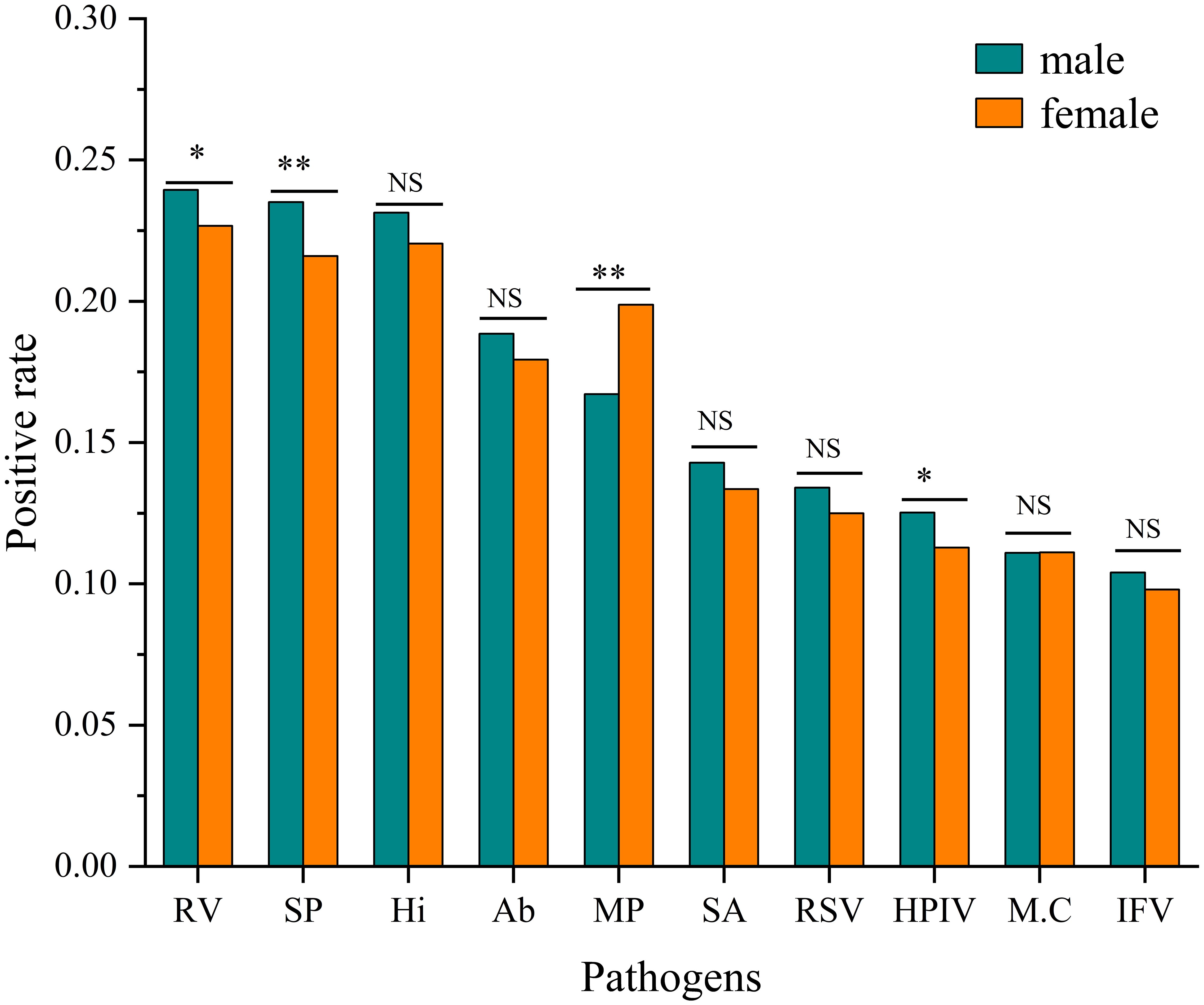 Figure 2. Comparison of positive rates by pathogen and gender. Infection rates for each pathogen are shown for males and females. Statistical significance of differences between genders was determined by Pearson’s Chi-square tests (*P<0.05, **P<0.001, NS, Not Significant).