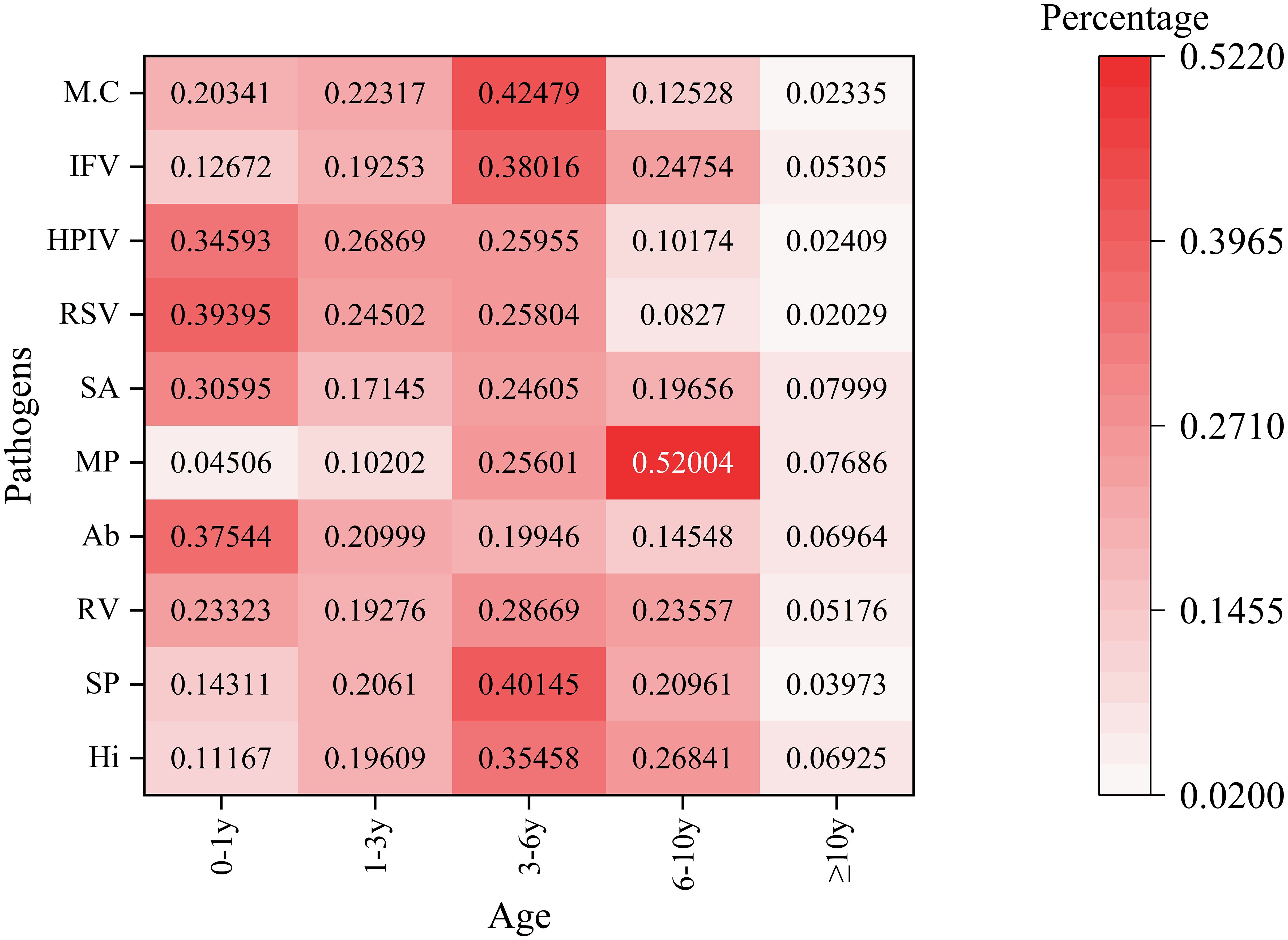 Figure 3. Age-stratified detection patterns of the top 10 respiratory pathogens This heatmap illustrates the percentage distribution of various pathogens across different age groups. The rows represent different pathogens. The columns categorize age groups as follows: 0 - 1y (0–1 year old), 1 - 3y (1–3 years old), 3 - 6y (3–6 years old), 6 - 10y (6–10 years old), and≥10y (10 years and older). The color intensity ranges from light pink (indicating a low percentage) to dark red (indicating a high percentage), reflecting the proportion of each pathogen within the corresponding age group. The numbers displayed on the heatmap represent the detection percentages of various pathogens across different age categories.