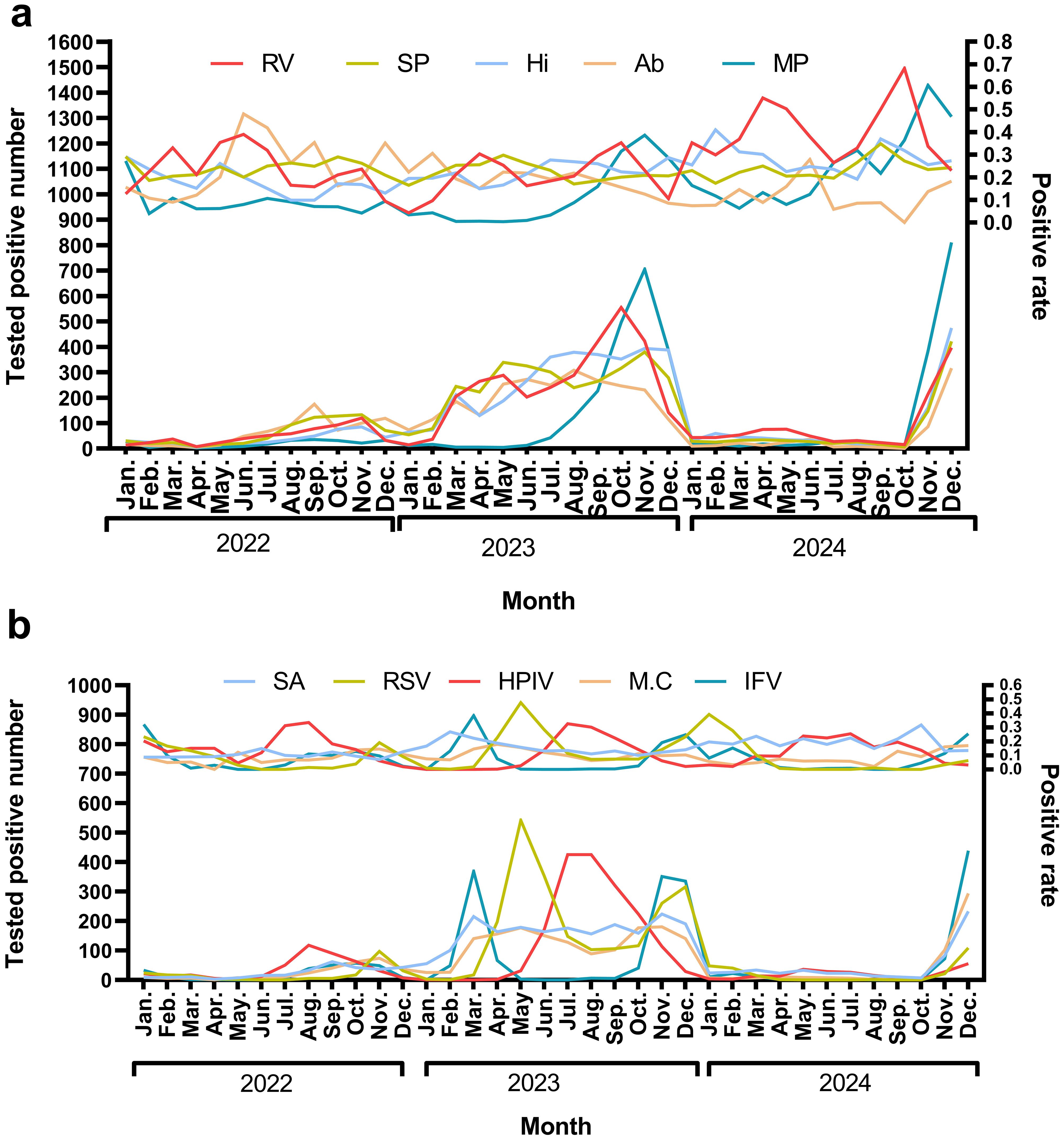 Figure 4. The monthly positive rate for top 10 pathogens In (a) the pathogens identified are Rhinovirus (RV), Streptococcus pneumoniae (SP), Haemophilus influenzae(Hi), Acinetobacter baumannii (Ab), and Mycoplasma pneumoniae(MP). The upper panel illustrates the trend in positive rates, while the lower panel depicts the trend of the number of positive tests. In (b) the pathogens include Staphylococcus aureus(SA), Respiratory syncytial virus(RSV), Human parainfluenza virus(HPIV), Moraxella catarrhalis(M.C), and Influenza virus(IFV). Consistent with (a) the upper panel shows the positive rate trends, and the lower panel indicates the number of positive tests.