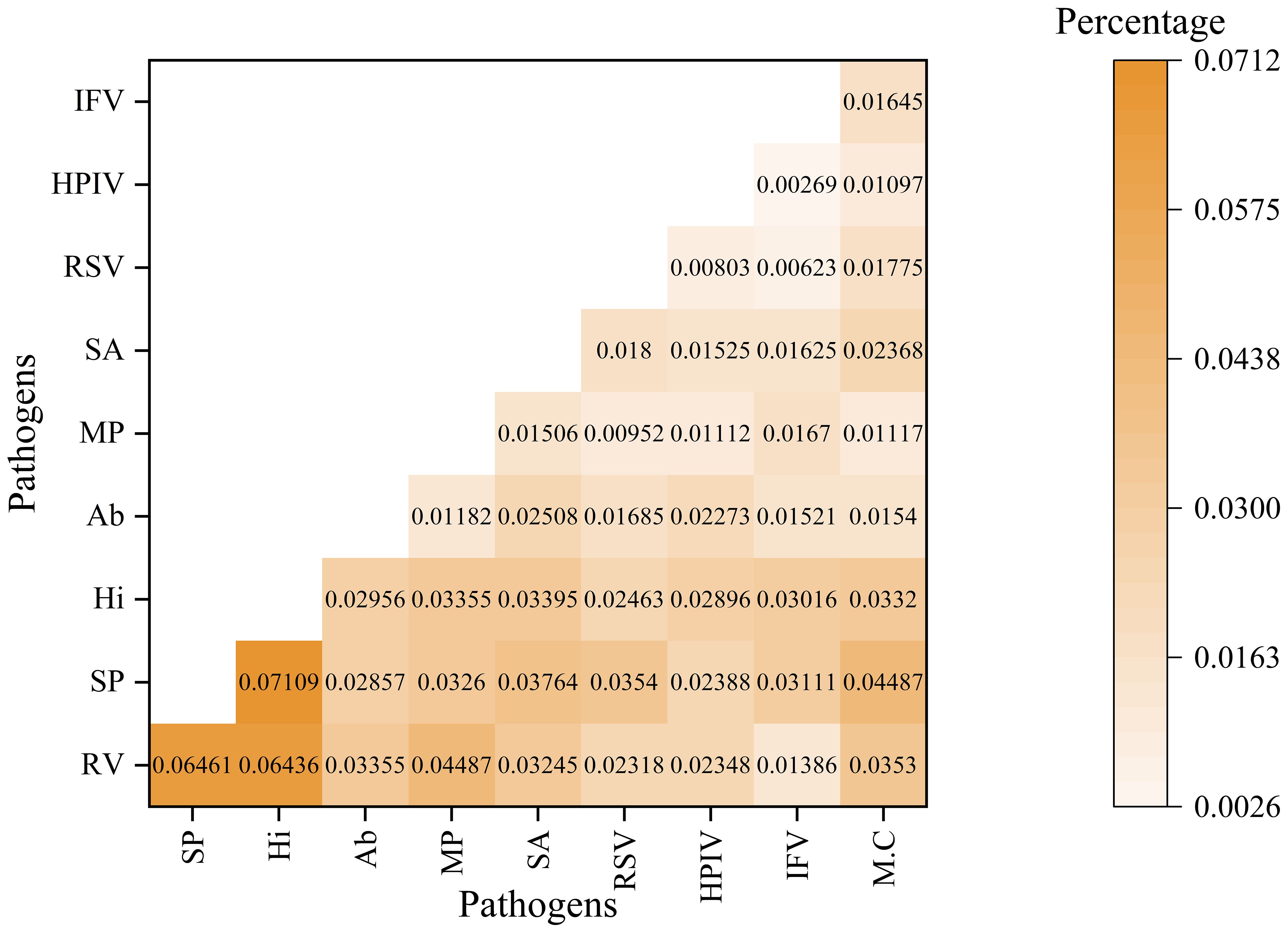 The analysis of pathogen co-occurrence revealed complex interaction patterns (Figure 5). The predominant finding was bacterial-viral co-infection, which accounted for 49.03% of the cases, followed by bacterial infections alone at 15.69%. Notably, triple co-detection involving viruses, bacteria, and other pathogens including Mycoplasma pneumoniae, Chlamydia pneumoniae, Chlamydia psittaci, Chlamydia trachomatis, Ureaplasma urealyticum, Ureaplasma parvum, Mycoplasma hominis, Mycoplasma genitalium was observed in 5.77% of the cases, while single viral infections represented 13.82% of the detections. The co-detection analysis of the top ten pathogens demonstrates that common co-detection patterns frequently involve combinations of bacteria (e.g., Hi and SP) (Figure 6). The clinical significance of these co-infections, particularly their potential impact on disease severity, warrants further investigation.