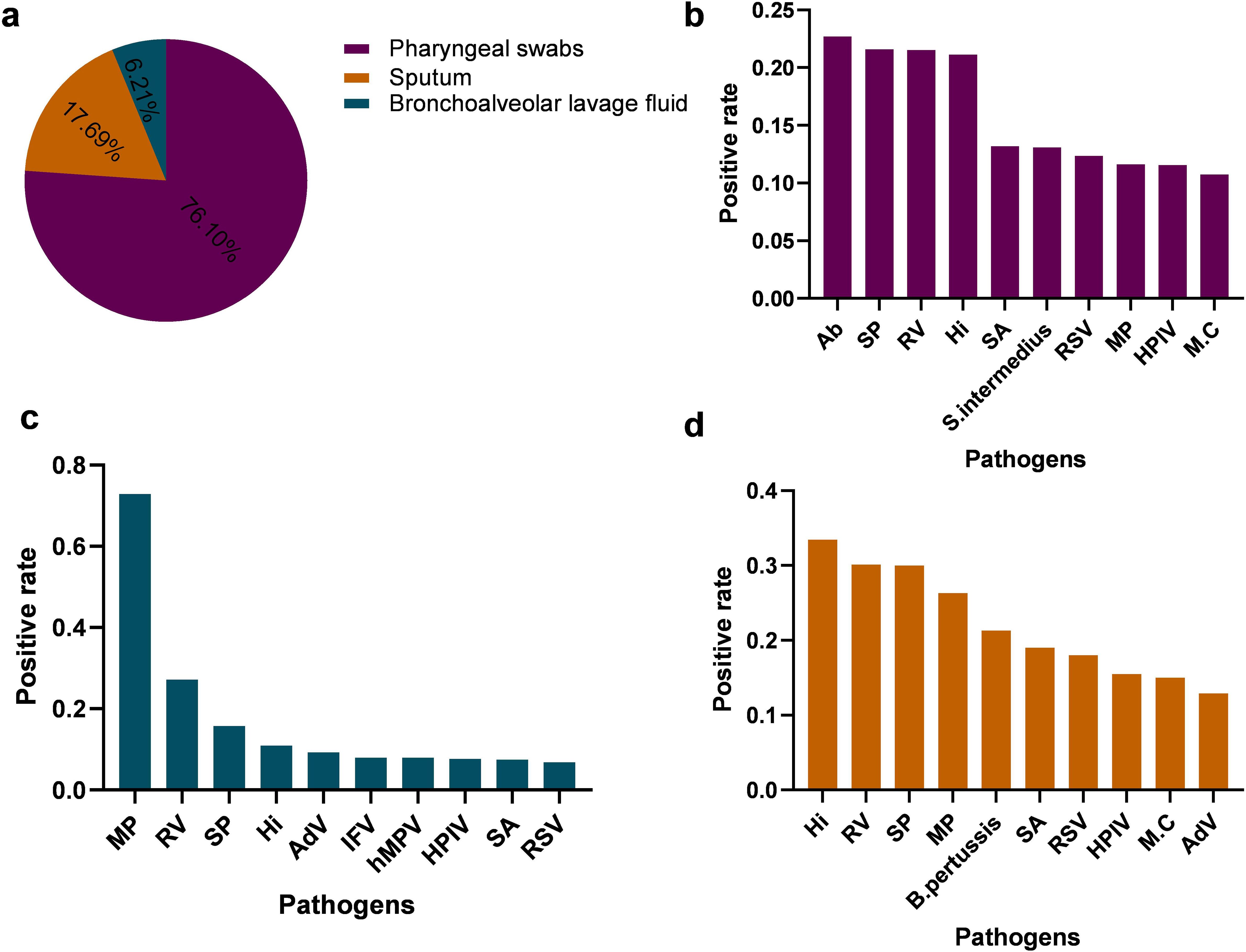 Figure 7. Comparison of positive detection rates of respiratory pathogens in different respiratory specimens (a) illustrate the types and distribution of respiratory specimens. (b–d) presents the positive rates and distribution of the top ten pathogens identified in pharyngeal swab specimens, Bronchoalveolar Lavage Fluid,Sputum, respectively. S. intermedius, Streptococcus intermedius; AdV, Adenovirus; hMPV, Human metapneumovirus; B. pertussis, Bordetella pertussis.