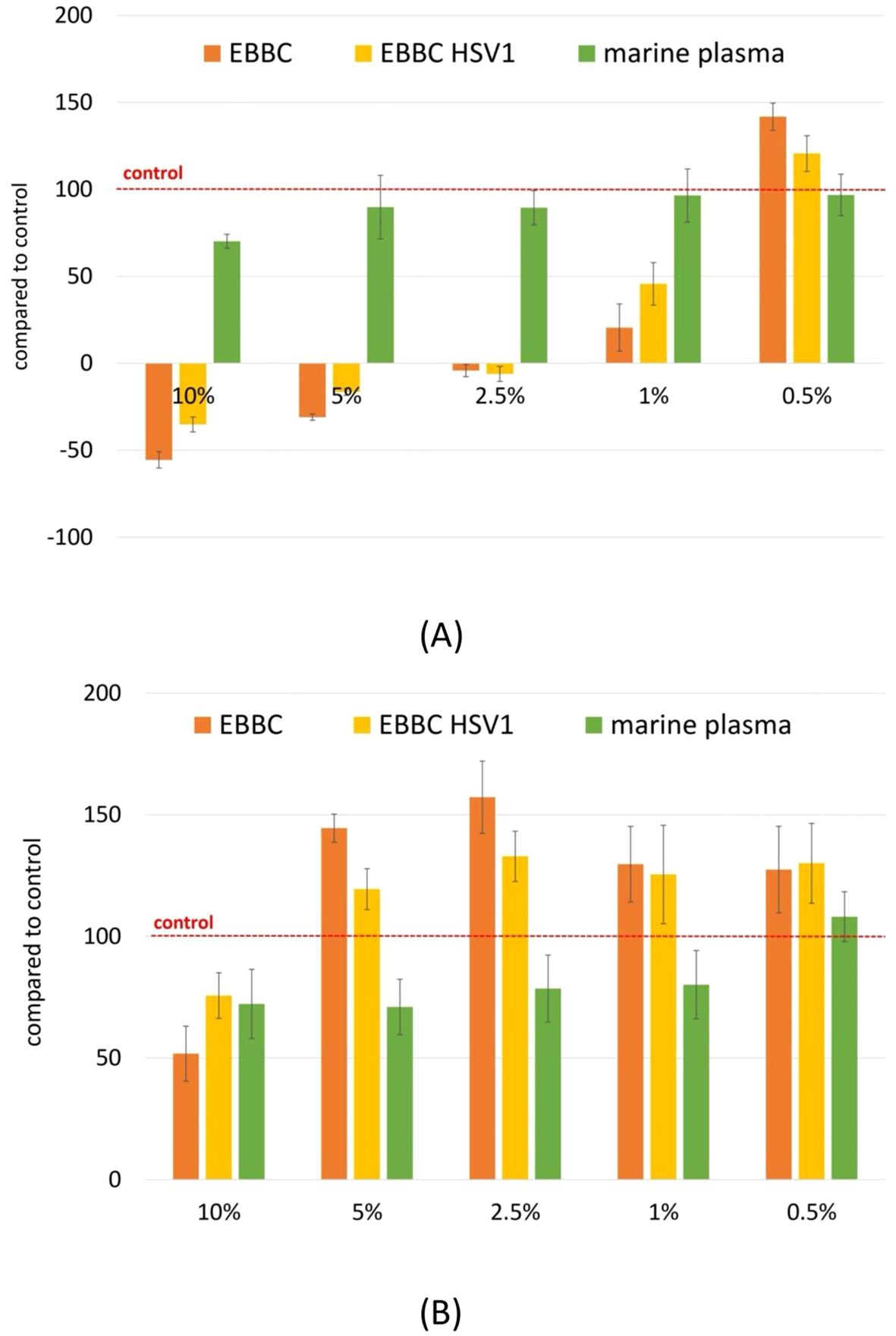 Figure 2. Evaluation of biological activity of EBBC in SRB assay for normal epithelial cells CCD841 (A) and fibroblasts NHDF (B). Scores below 0 indicate cytotoxicity, scores ranging from 0 to 100 indicate inhibition of cell growth, scores above 100 indicate stimulation of proliferation. Abbrevations: HSV-1– herpes simplex virus 1.