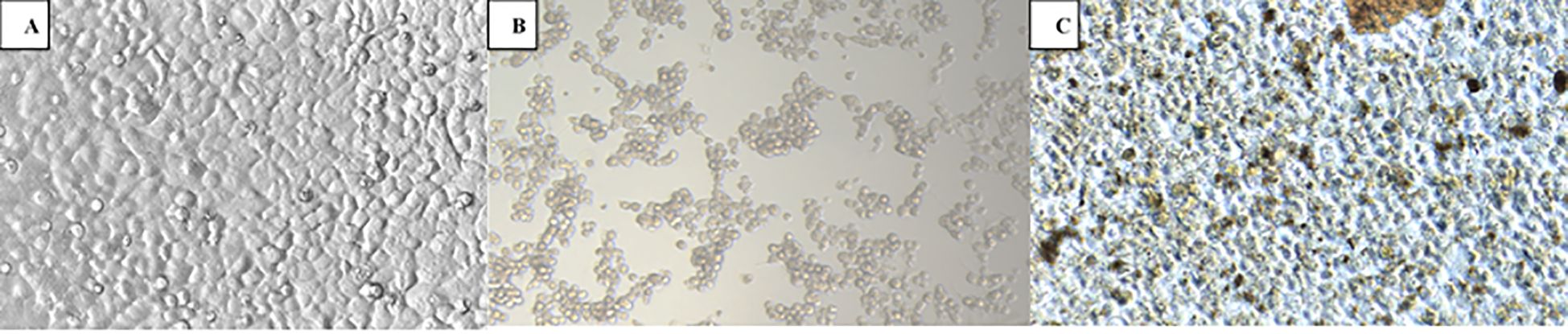 Figure 4. Antiviral potential of EBBC sample against human adenovirus type 5 used against HAdV-D36 (the specificity of virucidal activity): (A) Control – uninfected A549 cells, (B) HAdV-C5 infected A549 cells (positive control). (C) 1% EBBC + HAdV-C5 infected A549 cells. No visible cytopathic effect. Mag. 100x.