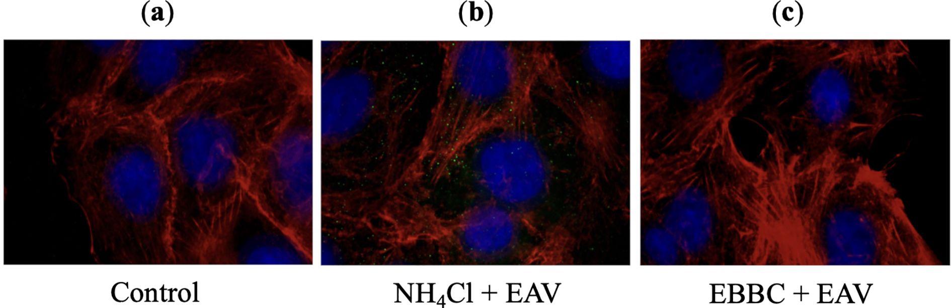 The Vero cell line and equine arteritis virus (EAV) were used to investigate the mechanism of action of EBBC as an inhibitor of viral entry via endocytosis, with ammonium chloride (NH4Cl) as a positive control (inhibitor). NH4Cl was dissolved in EMEM culture medium and filtered through a 0.22 µm syringe filter. EBBC was diluted in enhanced marine plasma. Vero cells were seeded on glass coverslips at a density of 3 × 105 cells per ml in a 24-well plate. EBBC and NH4Cl were diluted in cell culture medium to obtain 1%- and 25-mM solutions, respectively. The cells were then pre-incubated with the tested substances for 2 h at 37 °C. After this time, the substances were removed and the virus (MOI 50 -multiplicity of infection) was added. The cells were incubated at 4 °C for 1 h to synchronize virions on the cell surface. Unbound virus was washed off with PBS and EMEM medium supplemented with 2% FBS. Then EBBC and NH4Cl at the indicated concentrations were added. Virus entry was initiated by returning the cells to 37 °C and the process was analyzed 3 h after infection. For this purpose, the cells were fixed with 4% paraformaldehyde (ThermoFisher Scientific, Waltham, MA, USA), permeabilized with 0.3% Triton X-100 (BioShop, Burlington, ON, Canada) and blocked with 3% BSA (Albumin Bovine Fraction, BioShop, Burlington, ON, Canada) for immunostaining. Each step was followed by three washes with PBS. Fixed cells were subjected to immunostaining with the following reagents: primary antibody, a monoclonal anti-N virus nucleocapsid protein antibody (Equine Arteritis Virus EAV MAb IgG1 Isotype, VMRD, Pullman, WA, USA); secondary antibody, goat anti-mouse IgG Alexa Fluor® 488 (Abcam, Cambridge, UK); phalloidin-iFluor 594 reagent conjugate (Abcam, Cambridge, UK) for actin filaments; and DAPI reagent (Sigma Aldrich, Burlington, MA, USA) for nuclear staining. Fluorescence microscopy was performed using an inverted light microscope (Axio Observer) with a Zeiss 100x A-Plan objective.