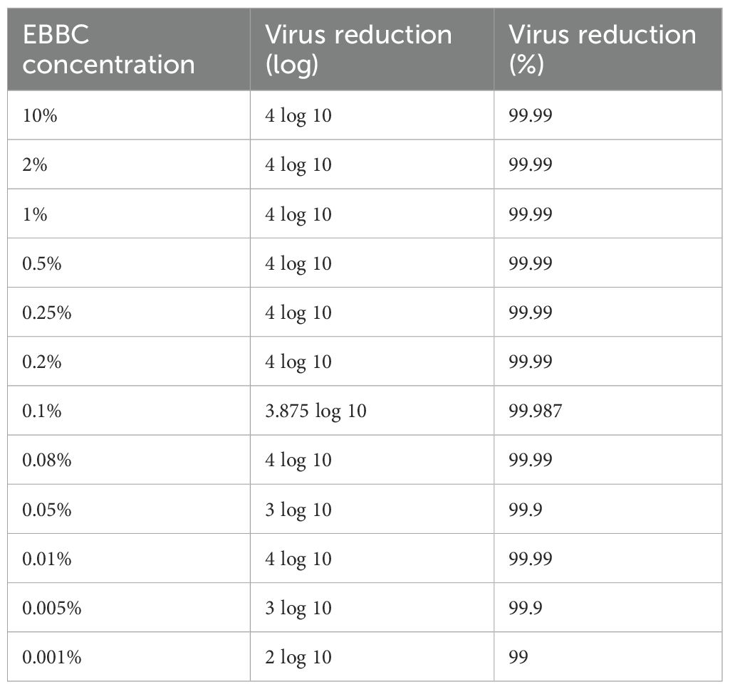 EBBC was effective even at 0.01% concentration, and at 0.001% concentration EBBC reduced the virus titer by 2 log (virucidal efficacy of 99%) (Table 4). Nevertheless, the most reliable concentration of EBBC at which we observed 99.99% efficacy against all viruses tested was 0.2%.