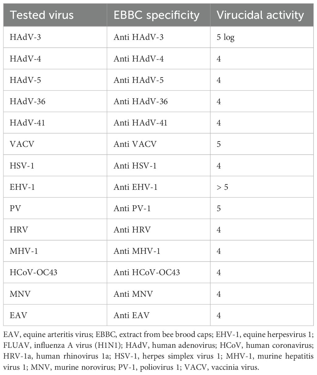 Virucidal activity for different concentrations of EBBC (ranging from 0.001% to 10%) and various contact times (5, 10, 15, and 60 min) were tested. Virucidal activity of EBBC against viruses not originally inoculated into the hive was also evaluated.
