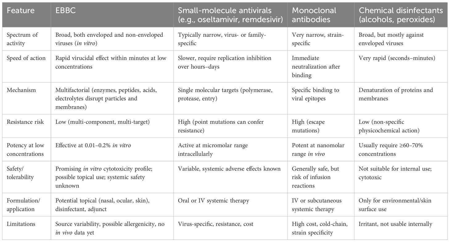 EBBC offers several features that may be advantageous compared with conventional small-molecule antivirals or experimental biological therapies (Table 7). First, EBBC demonstrates broad-spectrum, rapid virucidal activity in vitro, achieving ≥4 log10 reductions (≥99.99%) against a diverse panel of both enveloped and non-enveloped viruses at low concentrations (effective concentrations down to 0.01–0.2%), and within short contact times (from 5 minutes), as shown in this study. This potency at low concentrations suggests utility for topical or local prophylactic/therapeutic applications (e.g., surface disinfectants, nasal or ocular formulations) where high local antiviral effect with limited systemic absorption is desirable. Second, the in vitro cytotoxicity profile is favorable: EBBC exhibited minimal toxicity at virucidal concentrations in our SRB assays and even stimulated fibroblast proliferation while showing concentration-dependent epithelial effects, indicating a potentially wide therapeutic window for localized use. Third, unlike single-target antivirals, EBBC is a complex mixture that likely acts through multiple concurrent mechanisms (lysozyme and other antimicrobial peptides, organic acids, and marine plasma electrolytes that can disrupt envelopes and viral particles), which reduces the likelihood that a single mutation would confer resistance and may provide robust activity against emerging variants. Finally, EBBC demonstrated stability (retention of virucidal efficacy after 12 months) and is derived from naturally occurring components, which could translate to acceptable tolerability for topical use. That said, there are important caveats: EBBC composition can vary depending on source and requires standardization; bee-product allergic potential (e.g., hypersensitivity to bee proteins) must be carefully evaluated and all current data are in vitro. Therefore, definitive claims about comparative safety and systemic use cannot be made without targeted in vivo toxicology, pharmacokinetic assessments, and controlled clinical studies. Until such studies are performed, EBBC should be considered a promising topical/adjunct antiviral candidate rather than a replacement for approved systemic antiviral therapies or vaccines.
