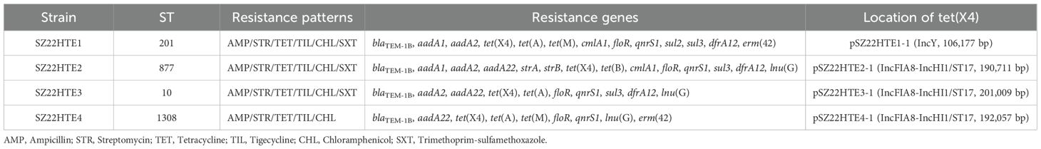 All four E. coli isolates exhibited resistance to tigecycline, with MICs ranging from 8 to 32 mg/L (Supplementary Table S2). They also displayed resistance to multiple antibiotics, including ampicillin, streptomycin, tetracycline, and chloramphenicol (Table 1). Additionally, three isolates (SZ22HTE1–SZ22HTE3) were resistant to sulfamethoxazole/trimethoprim, whereas SZ22HTE4 remained susceptible. In contrast, all isolates were susceptible to cefotaxime, meropenem, gentamicin, amikacin, nalidixic acid, ciprofloxacin, colistin, and fosfomycin (Supplementary Table S2). According to the standard definition—resistance to at least one agent in three or more antimicrobial classes—all isolates were classified as multidrug-resistant (MDR).