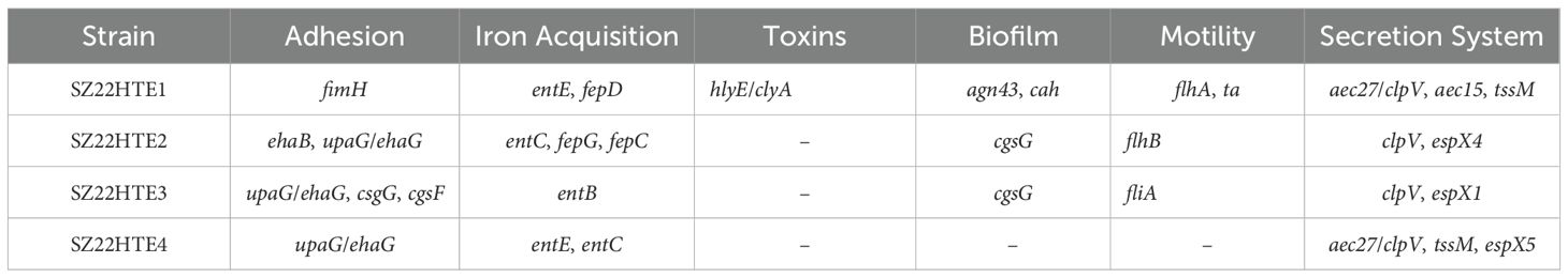 Gene associated with biofilm formation (agn43, cah, and cgsG) were detected in SZ22HTE1 to SZ22HTE3 and may enhance persistence and immune evasion. Motility-related genes (flhA, flhB, and fliA) were present in the same three isolates, likely facilitating bacterial movement and invasion. Secretion system genes (aec27/clpV, aec15, tssM, espX4, espX1, and espX5) were identified in various combinations across all four isolates and may facilitate the delivery of virulence factors into host cells (Table 2). Although the specific virulence gene profiles varied among isolates, each strain possessed multiple functional categories of virulence factors, underscoring their potential to cause clinically relevant infections.