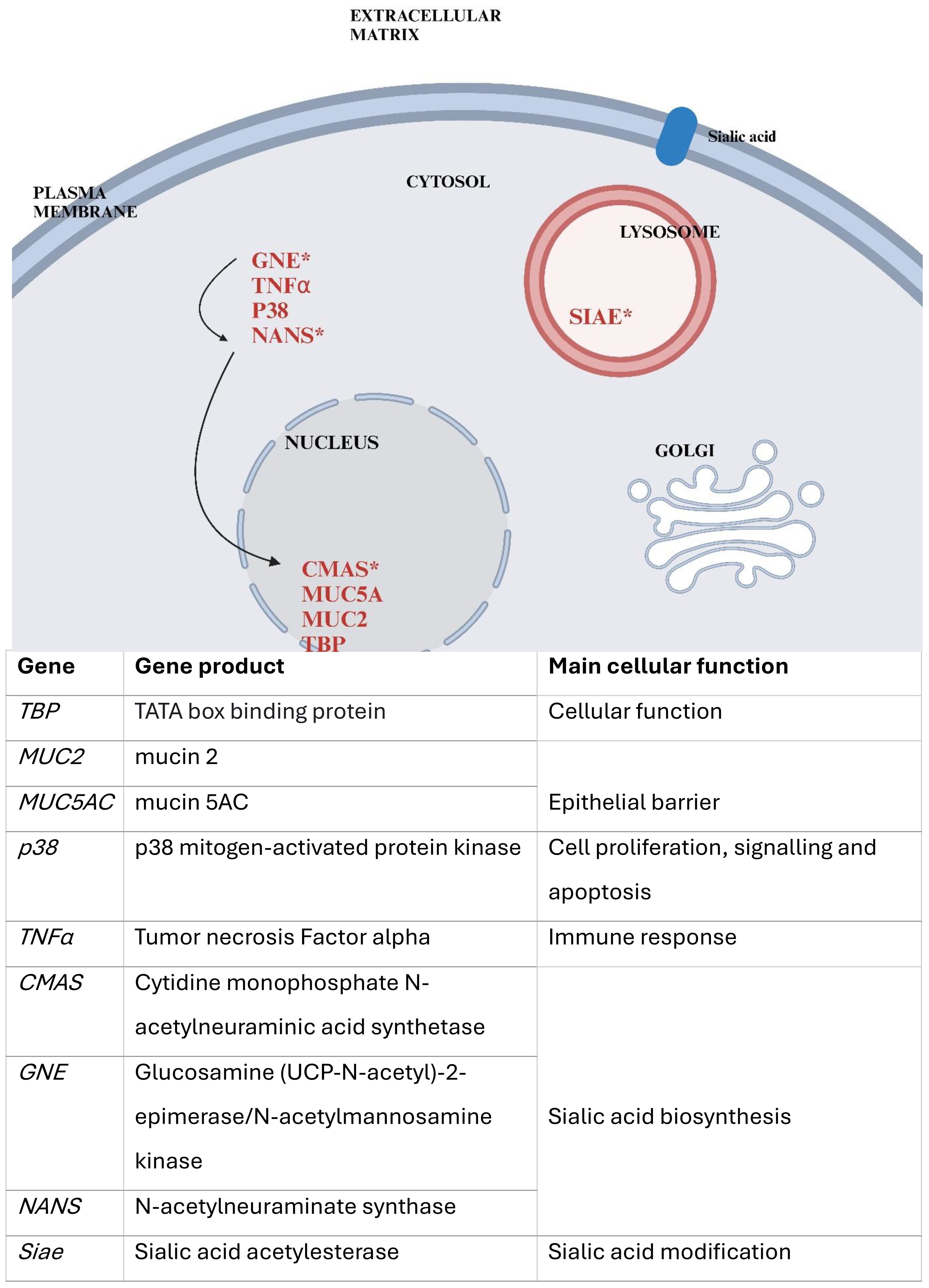Figure 1. Provides a simplified overview of the cellular localization of the selected gene products and their roles. Genes tested in this study are marked in red, those involved in sialic acid biosynthesis indicated by an asterisk (*). Arrows represent the biosynthetic pathway of sialic acid, beginning with GNE, followed by NANS, and later CMAS. The figure was created using Biorender and is based on the figure in NCBI: Sialic Acids - Essentials of Glycobiology(X).