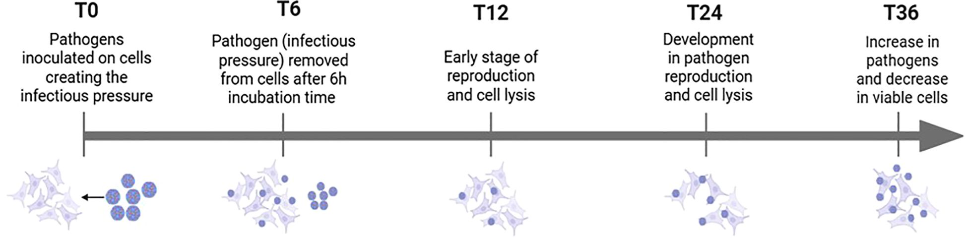 Figure 2. Overview of how infectious pressure develops over time, including pathogen-cell interactions and morphological changes observed under the microscope.