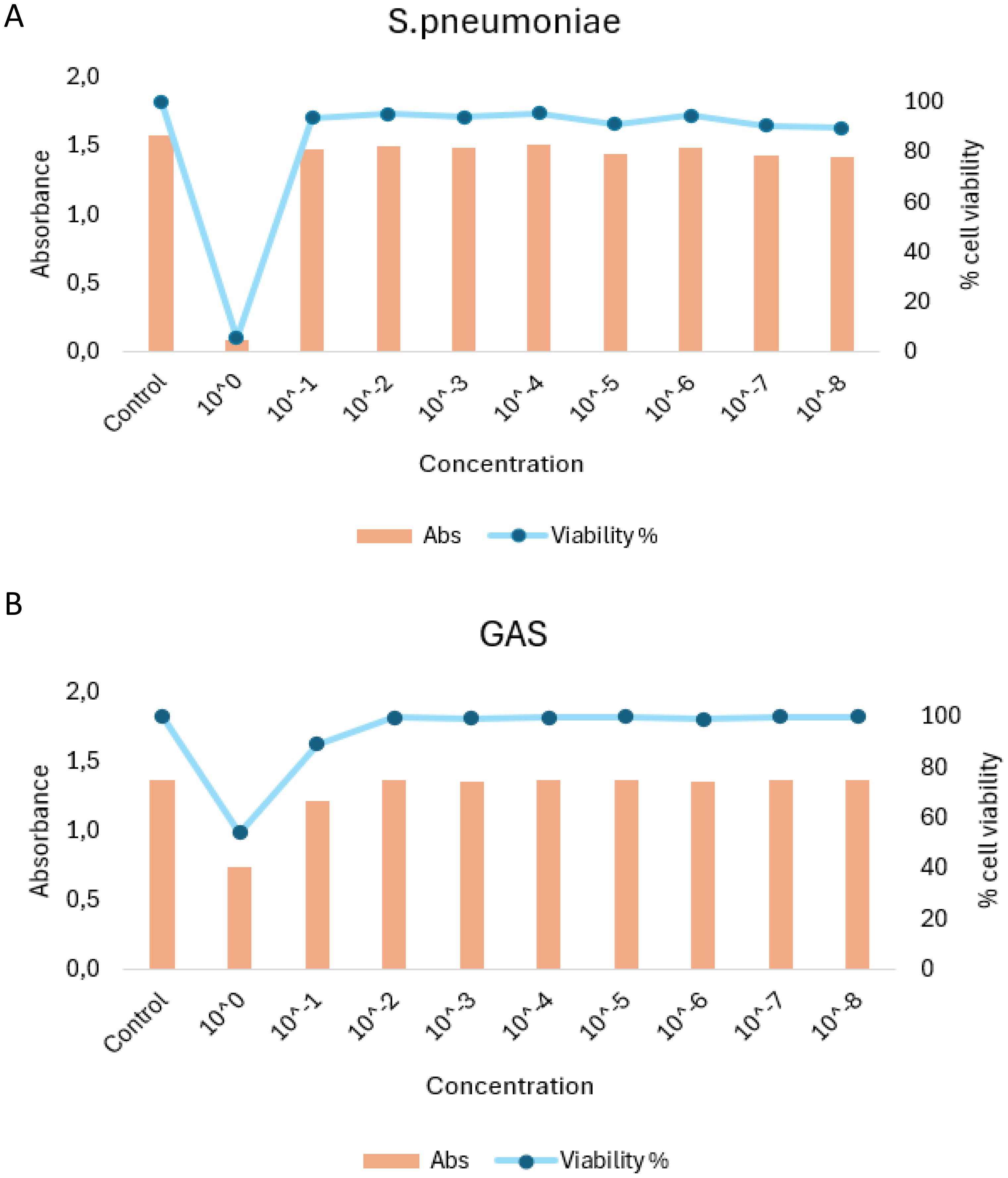 Figure 3. MTT viability assay results for A549 cells infection with S. penumoniae (A) and GAS (B). Cells were exposed to infection pressure for 6 hours, followed by washing and incubation. Absorbance (Abs) values are shown on the left y-axis, percentage of visible cells on the right y-axis, and pathogen concentration on the x-axis.