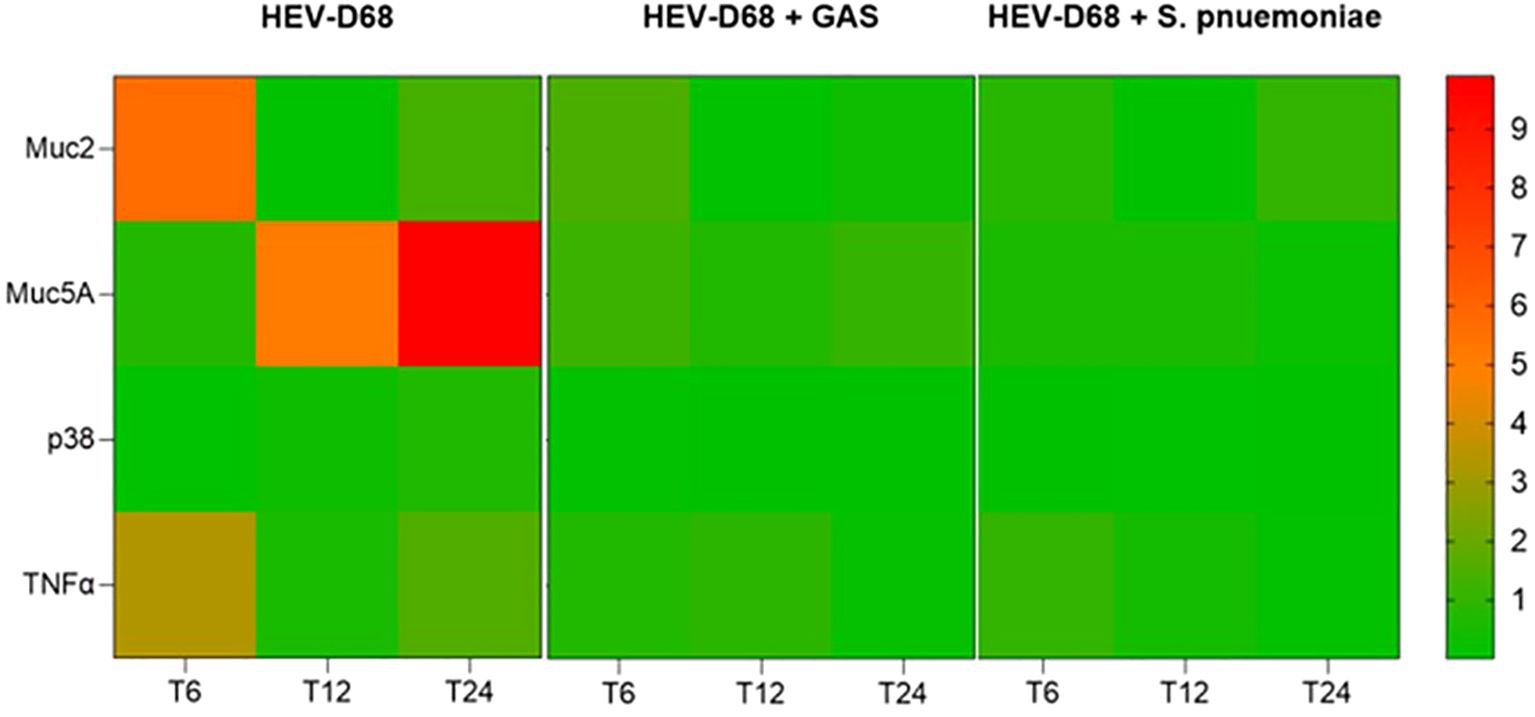 Figure 4. Presents a heatmap showing the relative expression of MUC2, MUC5AC, p38 and TNFα over time (6-, 12-, and 24-hours post-infection). Each row represents a gene, and each column corresponds to a time point across different infection conditions. Red indicates upregulation, while green indicates downregulation compared to uninfected control cells.