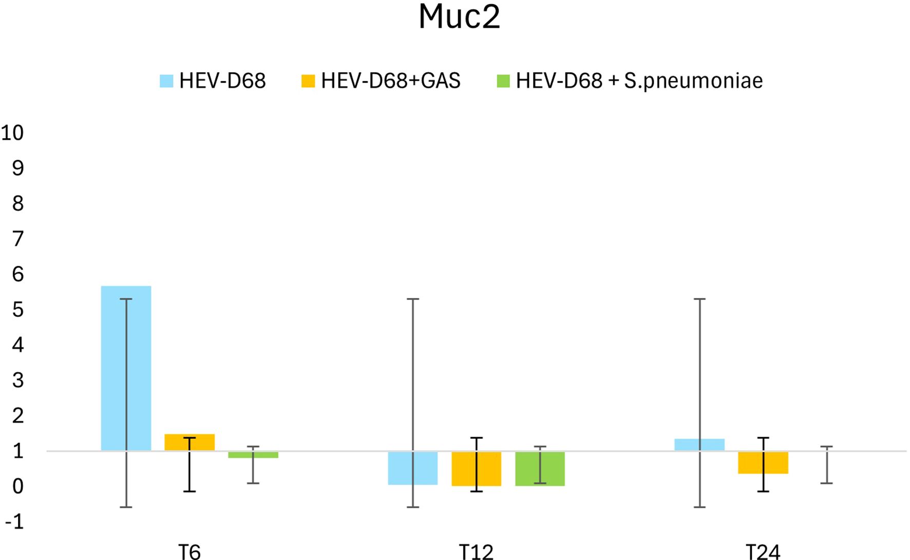 HEV-D68 infection triggers a dynamic cellular response, as illustrated in Figure 5 (MUC2). During co-infections, however, changes in the surrounding environment alter the cellular response. The virus appears to affect cells differently when competing with bacteria, resulting in gene expression patterns that diverge from those seen in mono-viral infections. Bacterial virulence factors, such as pneumolysin from S. pneumoniae disrupt epithelial integrity and suppress antiviral responses by modulating host signaling pathways (Rai et al., 2016). This suppression may explain the reduced expression of mucin and cytokine genes during co-infections. Bacterial factors interfere with host defenses, leading to a more complex and potentially attenuated immune response compared to mono-viral infections (Fieber and Kovarik, 2014; Melvin and Bomberger, 2016).
