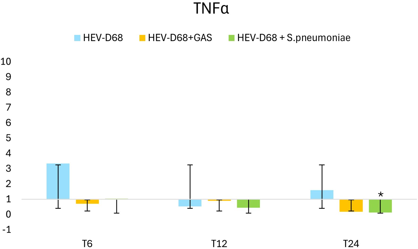 TNFα expression peaked between 6- and 12-hours post-infection, coinciding with active viral replication and high infectious pressure as shown in Figure 6. After the medium was refreshed at T6, expression declined, indicating a reduced immune response as extracellular pathogen levels decreased. However, as intracellular replication continued, expression began to rise again toward 24 hours. In co-infections, TNFα expression was less pronounced, suggesting that bacterial presence may dampen the immune response triggered by the virus. This supports the observation that mono-viral infections elicit a stronger cellular reaction compared to co-infections.