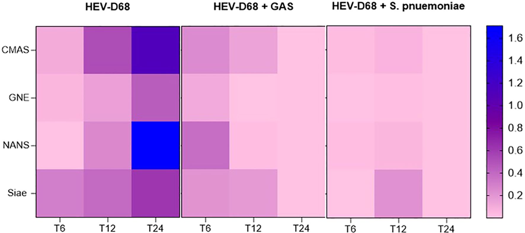 The variability observed between mono-viral infection and bacterial co-infection can be attributed to difference in pathogen replication rates. S. pneumoniae has a generation time of approximately 24–36 under optimal conditions, whereas HEV-D68 has a replication cycle of about 8–12 hours. This cycle includes viral entry, replication, assembly of new particles, and release (Wang et al., 2017). These differences highlight the faster reproduction rate of viruses compared to bacteria. Viral replication is influenced by host cell conditions, while bacterial growth depends on nutrient availability and the microenvironment shaped by viral infection. Virus-induced cell lysis releases nutrients, which can enhance bacterial proliferation. Additionally, changes in pH and oxygen levels caused by viral infection may affect bacterial growth. To facilitate the interpretation, the genes are categorized into two groups: cellular response and sialic acid biosynthesis.